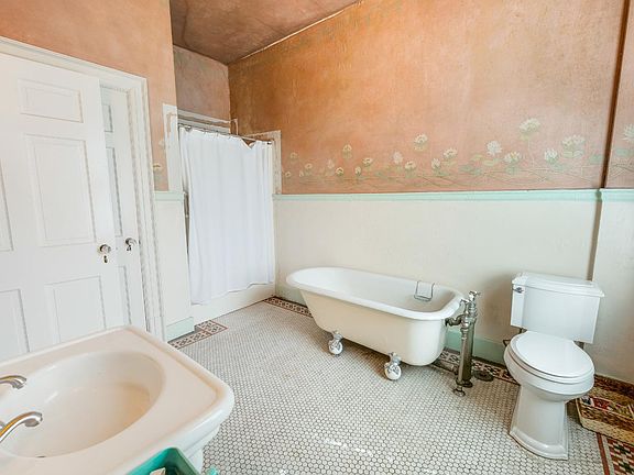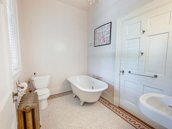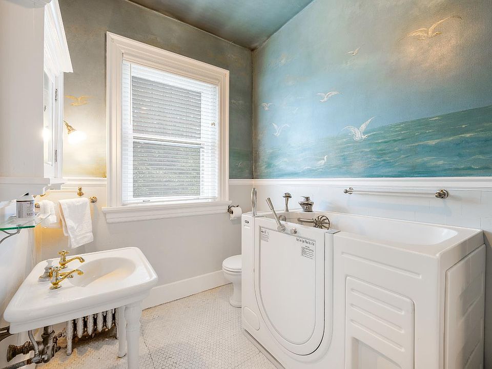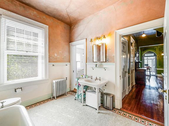- Bathrooms: Intact original bathrooms featuring classic honeycomb tile floors and wide porcelain sinks.