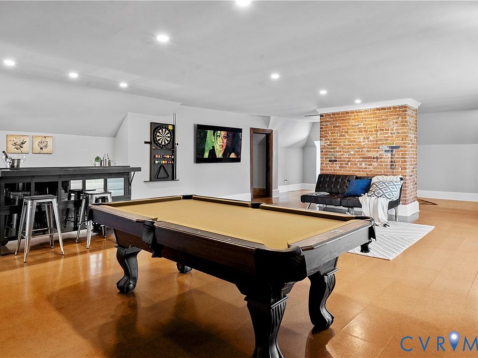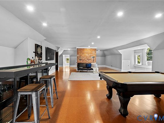 Every detail adds charm: two sweeping staircases, arched doorways, transoms, and six fireplaces with beautiful mantles and tile work surround. The main level offers grand entertaining spaces — twin living rooms, a formal dining room, and a kitchen with granite counters, cherry cabinetry, and newer stainless steel appliances. Upstairs, a spacious hall provides room for a cozy sitting area and opens to a delightful balcony accented by a chandelier overlooking Oliver Avenue. The third floor surprises with a 1,000+ sq ft recreation room complete with bar, pool table, and office space — ideal for parties or creative pursuits.