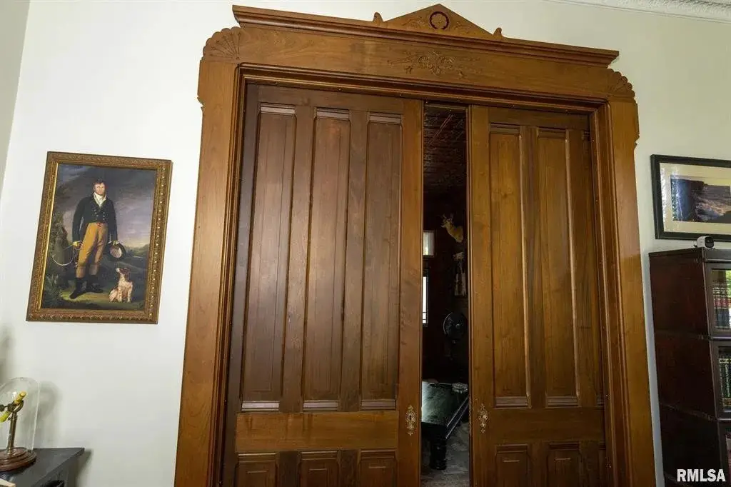A particularly noteworthy feature of the home is its collection of four pocket doors, located in various rooms throughout the residence. Pocket doors were a hallmark of fine 19th-century domestic architecture, allowing rooms to be reconfigured depending on the formality or intimacy of the moment. Many historic homes have lost these doors over time, but here they survive in beautiful condition—with the walnut set between the parlors being especially impressive.