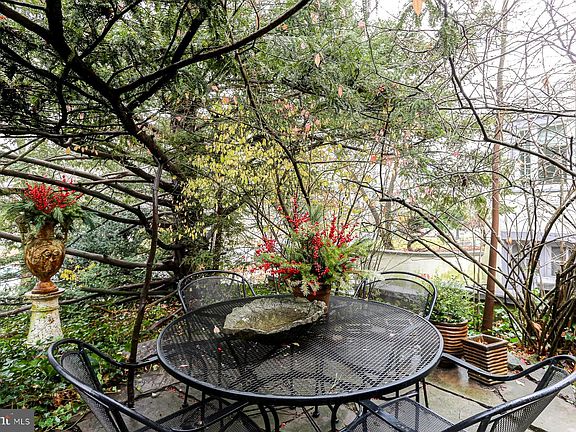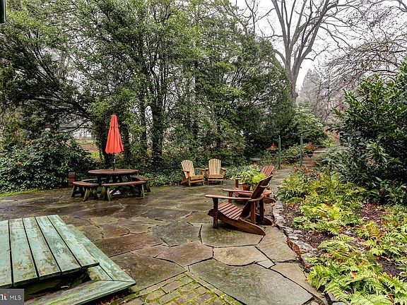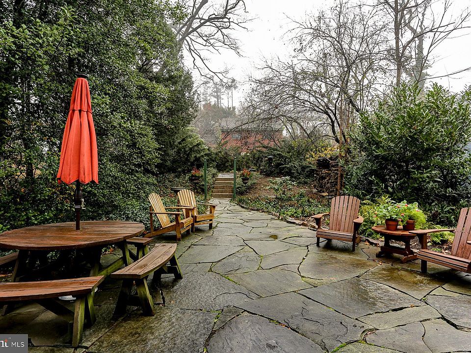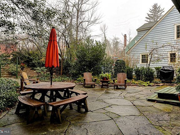 The backyard is a private paradise. It is filled with mature trees and pretty plants that make it feel like your own secret garden. There is a large patio where you can set up a grill and a table for outdoor eating. Whether you want to host a big party or just sit in the grass and enjoy the silence, this yard gives you the space to do it.