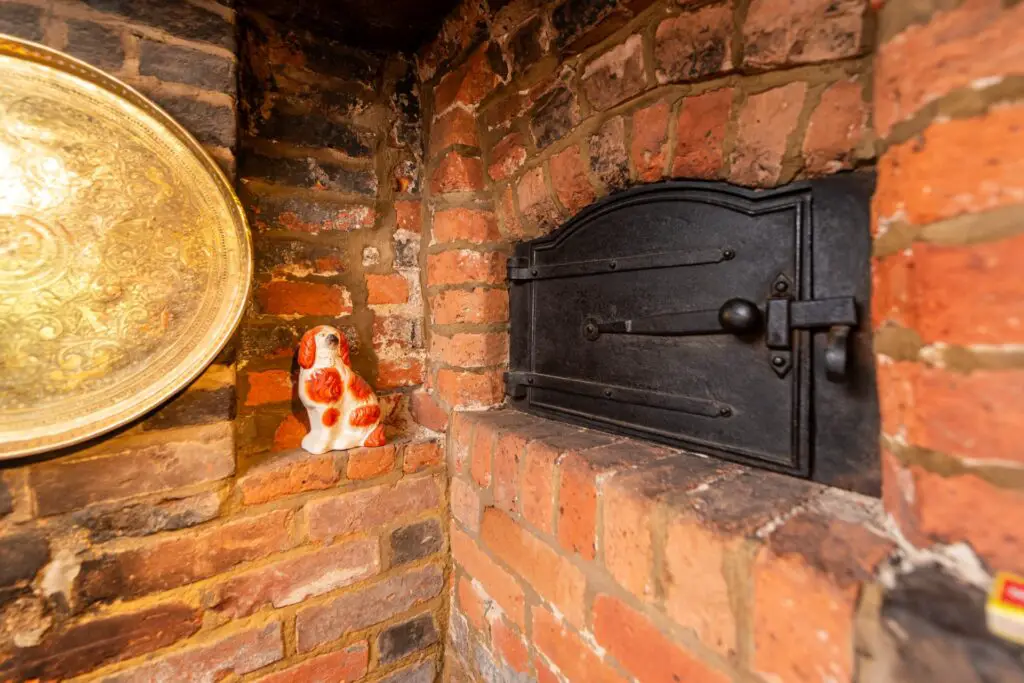 The best part of this cottage is the living room. It features a giant brick fireplace called an “inglenook.” Inside that fireplace, there is a wood-burning stove to keep you warm, but there is also a real surprise: the original bread oven! Back in the 1600s, this is where the family would have baked their daily bread.