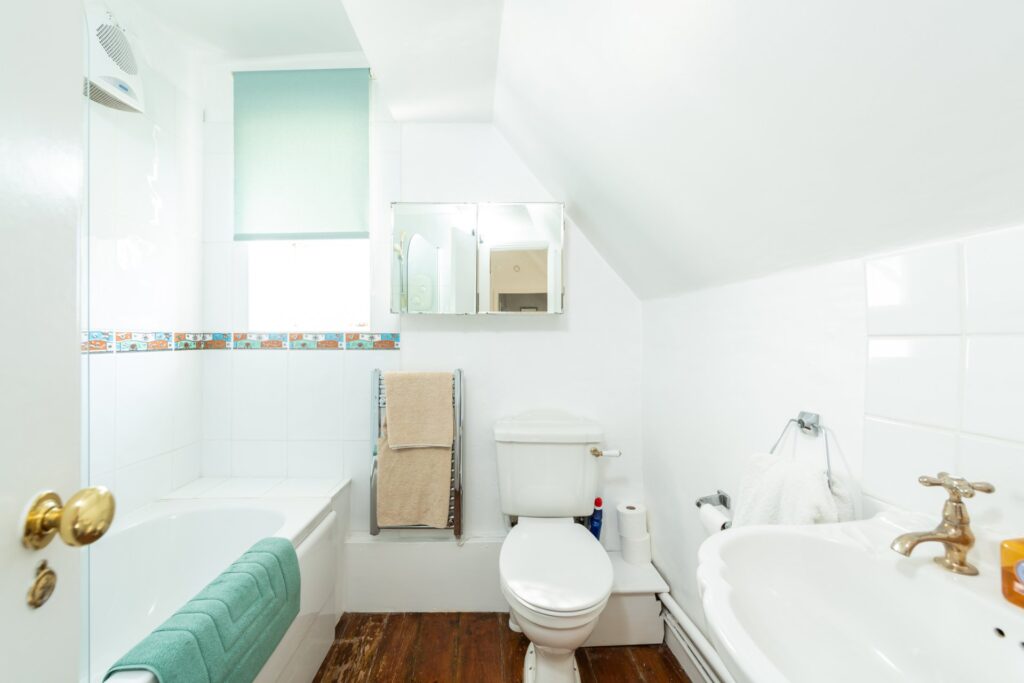 Even though it’s an old cottage, it is surprisingly big. There are five good-sized bedrooms and three bathrooms, which is perfect for a big family or for having friends over for the weekend. There is a long sitting room, a study where you can look out at the garden, and a formal dining room with beautiful old wood timbers on the walls.