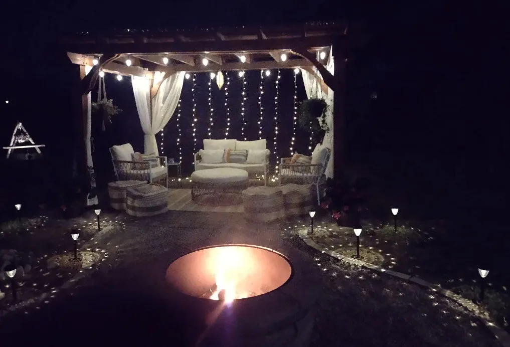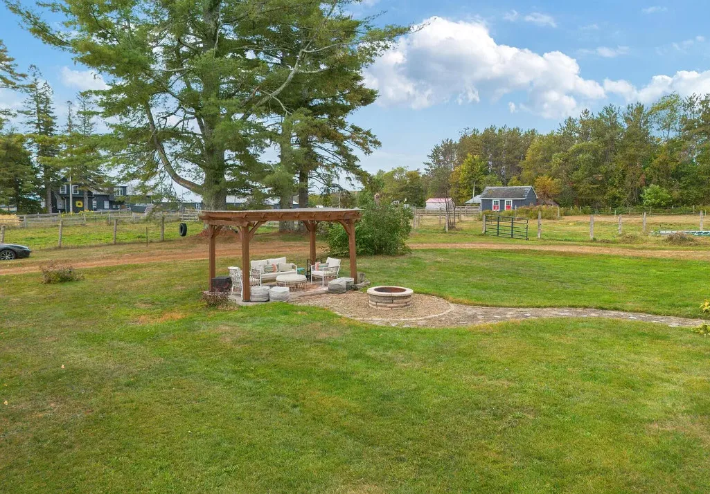 A fire pit area provides a cozy outdoor gathering spot for evenings under the stars, while the wide-open landscape surrounding the home ensures privacy and tranquility.
