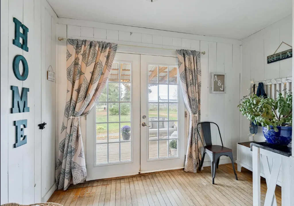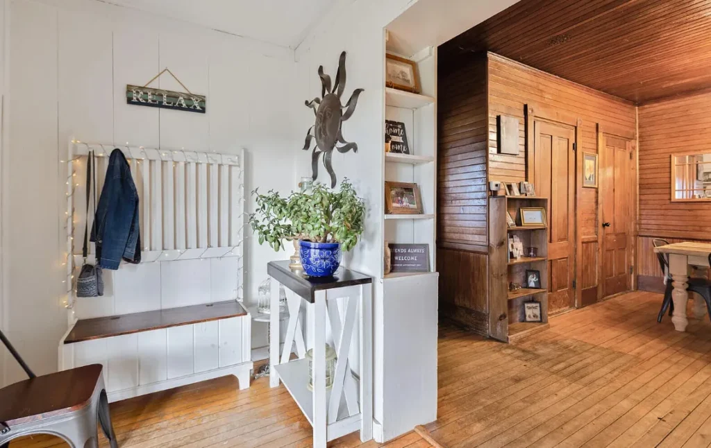 Arriving at the property, visitors are greeted by a welcoming side porch—an ideal place to enjoy your morning coffee while taking in the expansive yard and peaceful surroundings. The porch leads directly into a spacious entry area that sets the tone for the rest of the home. This central space creates an easy flow between living areas and provides an inviting introduction for guests.