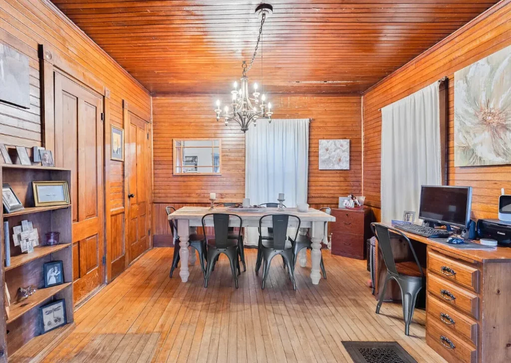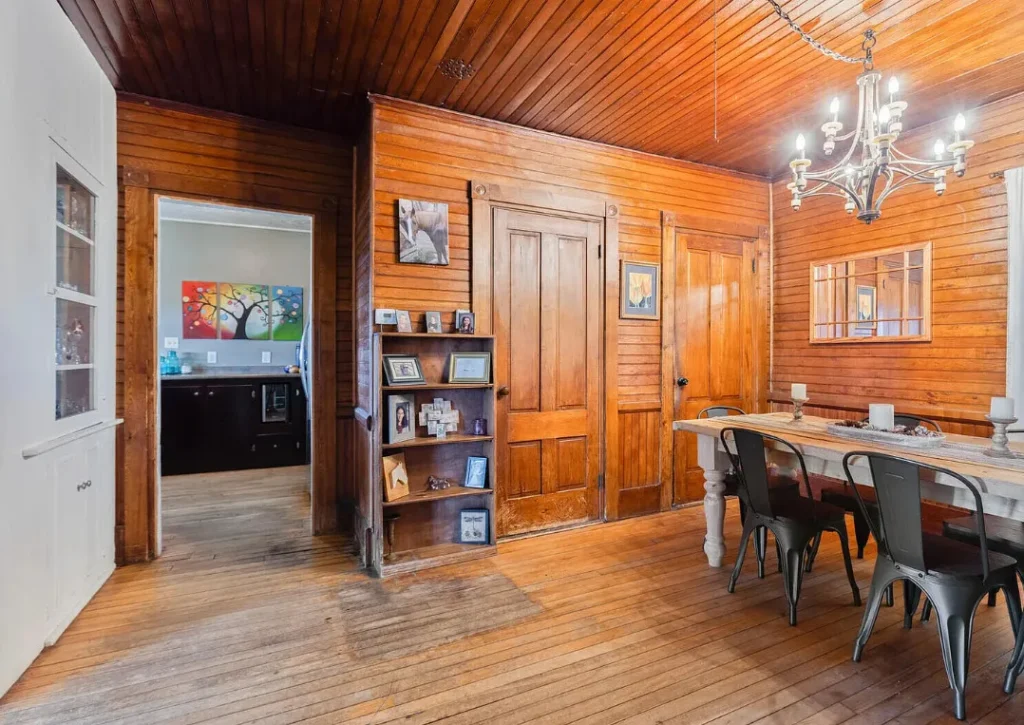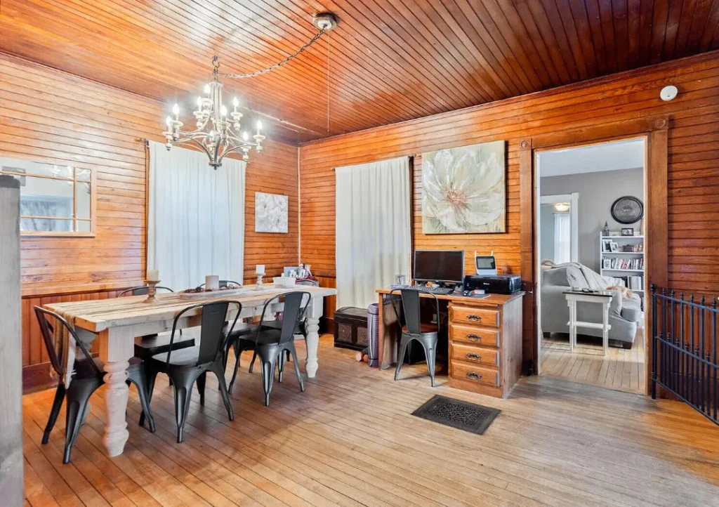 From the entryway, the home opens into a generous dining room that immediately feels like the heart of the house. With its open layout and easy access to both the kitchen and living room, this space is perfect for family meals, holiday gatherings, and everyday connection. Large windows fill the room with natural light, highlighting the warmth of the wood floors and period trim.