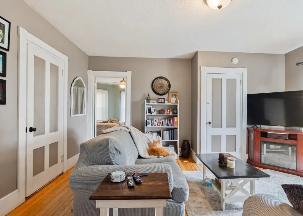 To the right of the dining room, a bright and open living room offers an inviting retreat. A large picture window frames views of the yard and floods the room with sunshine. This light-filled space serves as a comfortable area for relaxation, reading, or hosting friends.