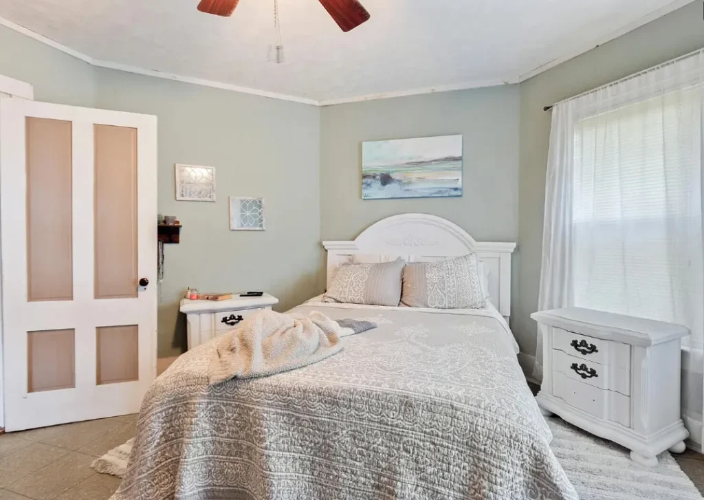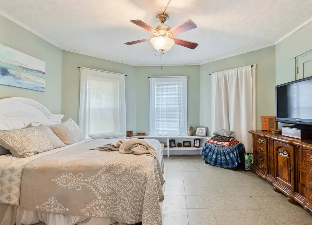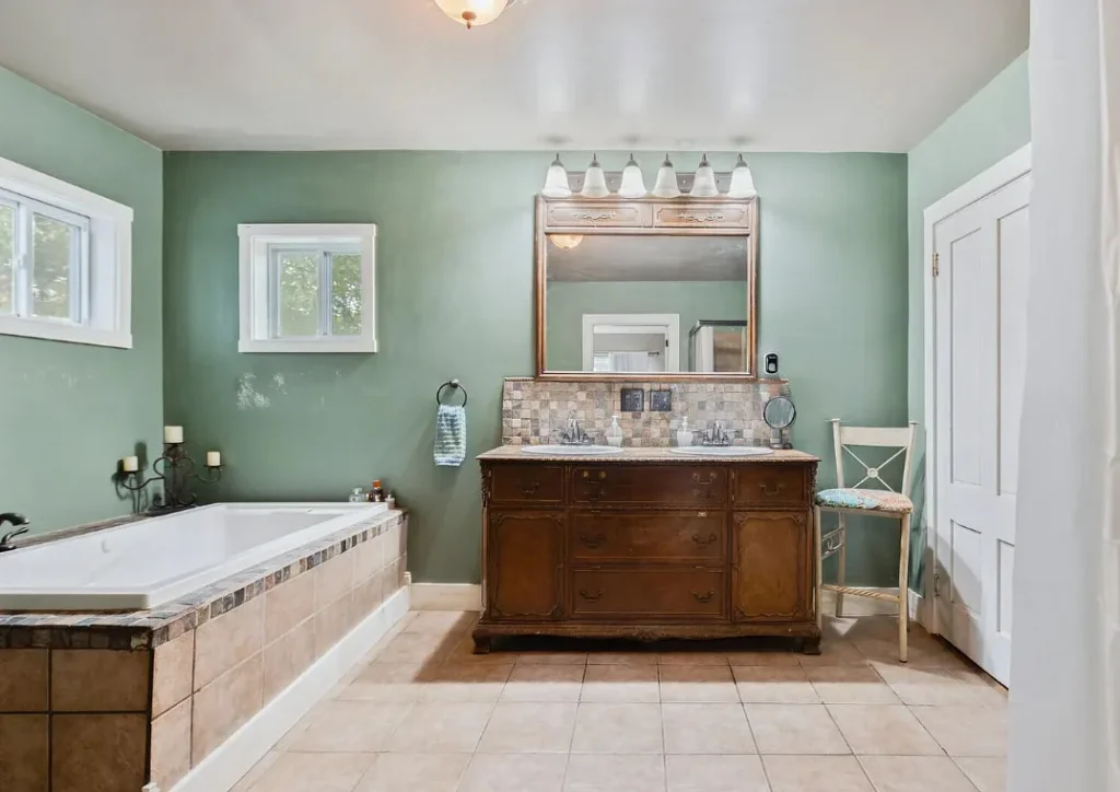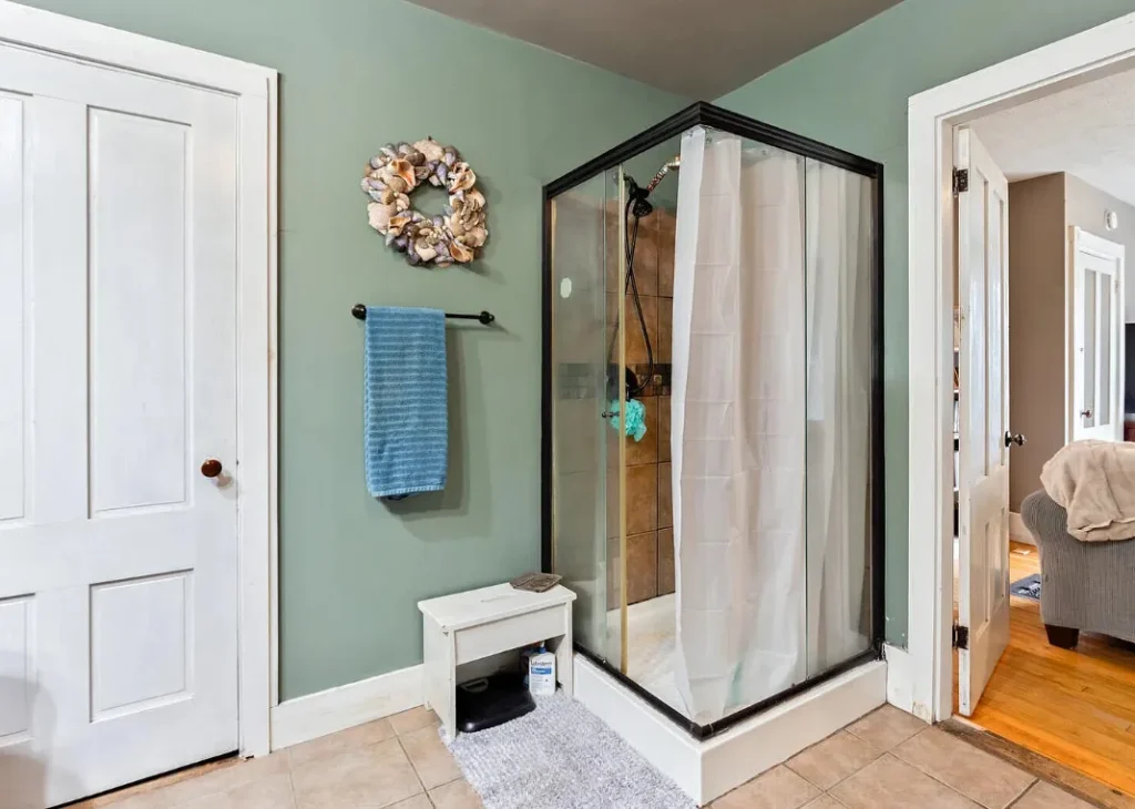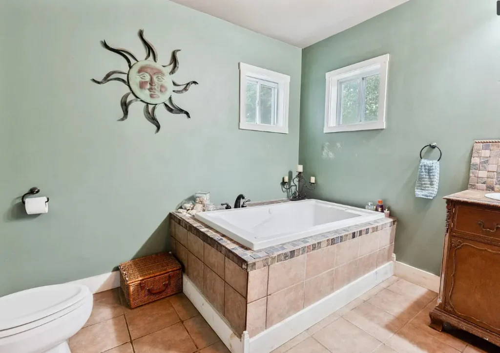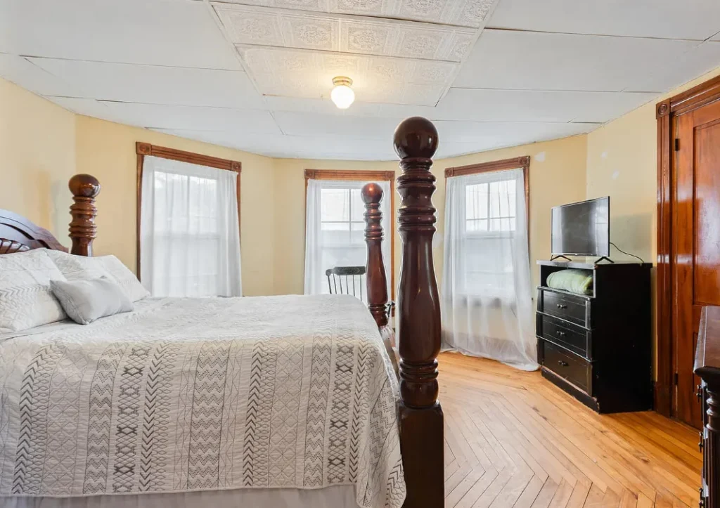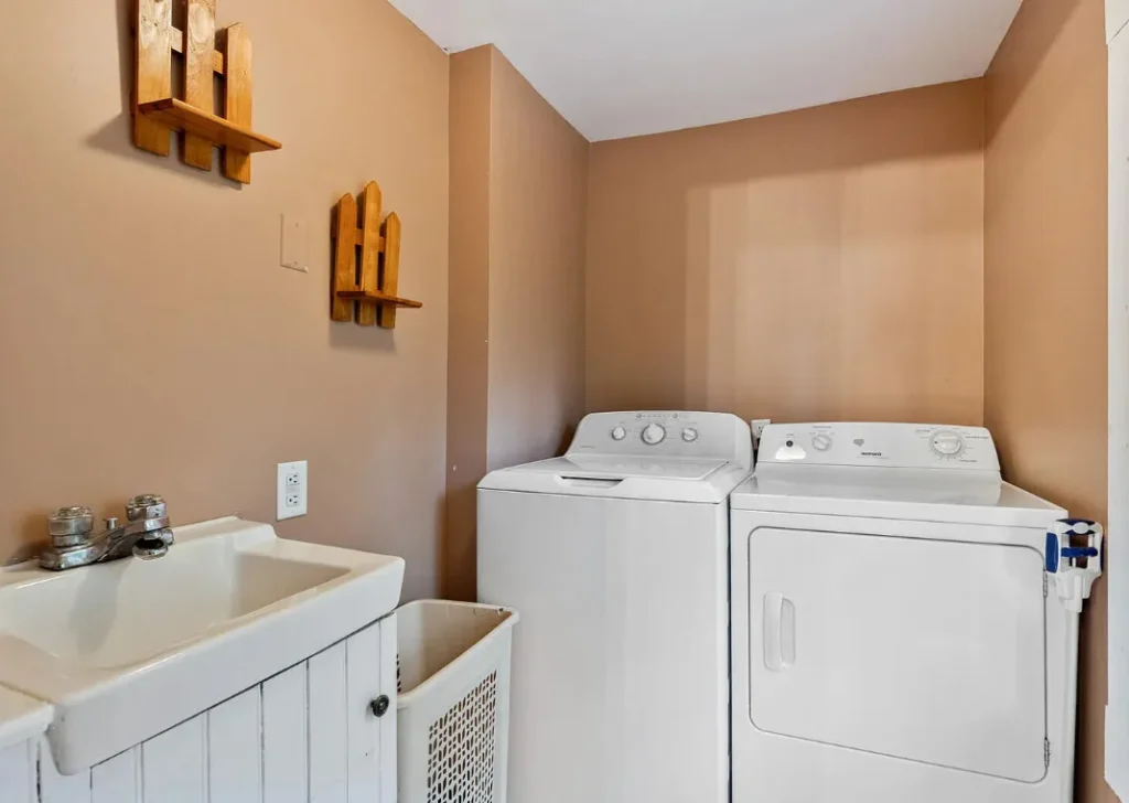 The first floor also features two well-sized bedrooms, providing flexibility for single-level living or guest accommodations. These rooms are positioned near a spacious bathroom that includes both a separate tub and shower—an uncommon luxury for a home of this era. A dedicated laundry area on the main level adds to the home’s practicality, making daily living convenient and efficient.