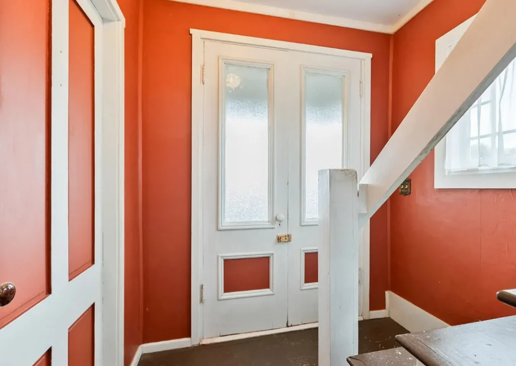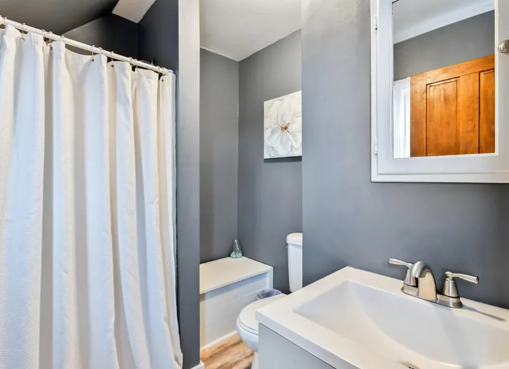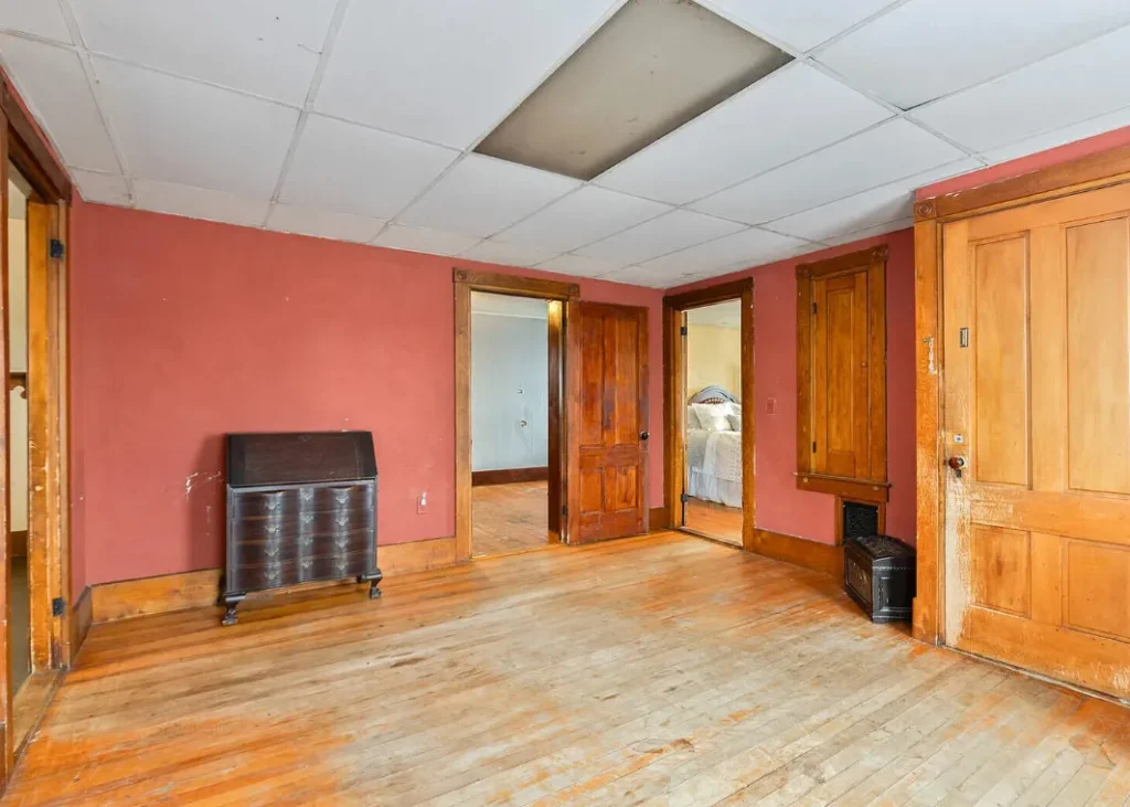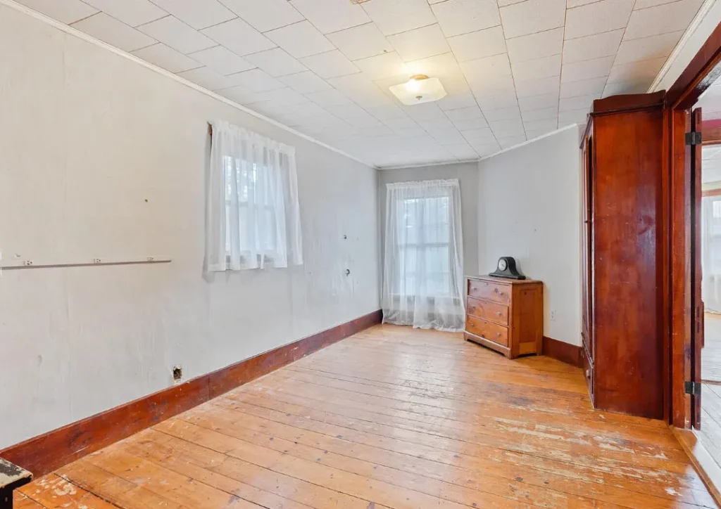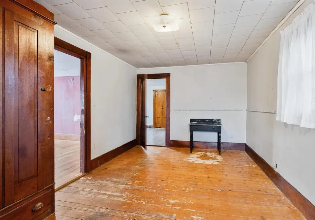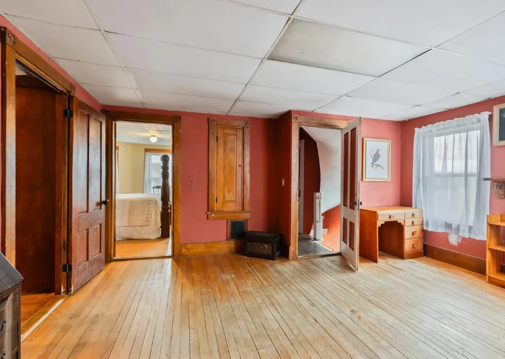 The home’s interior beautifully blends period details with contemporary improvements. Original wood flooring flows throughout much of the house, maintaining the warmth and authenticity that only aged hardwood can bring. Baseboards, beadboard accents, and wainscoting contribute to the farmhouse character, while updated bathrooms and fresh finishes make the space livable and comfortable for today’s standards. The overall layout pays homage to the craftsmanship of the early 20th century, yet offers the conveniences modern families value.