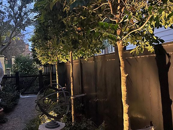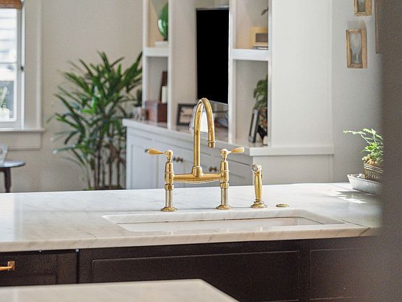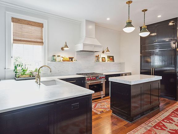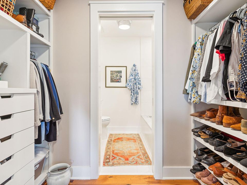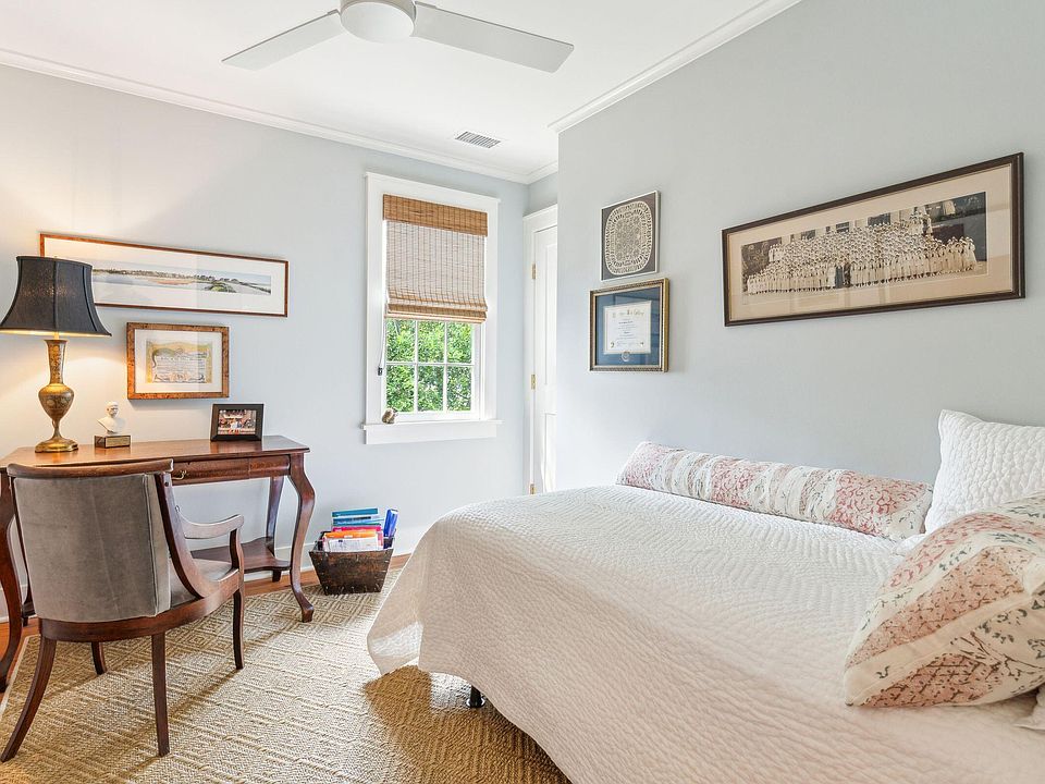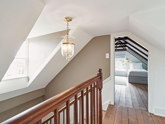 One of my favorite things about this house is the “naughty bar” hidden behind a secret door in the dining room—it’s so fun for entertaining! The kitchen is a total showstopper, too. It has deep marble counters, a cozy breakfast nook, and even hidden refrigerators just for wine and bubbly. The main house has four bedrooms, including a third-floor room that looks like a fairytale with exposed beams and built-in beds. The primary suite is a true retreat with its own dressing room and a hidden laundry room. Every corner of this house has a tiny detail, like crystal lights that throw rainbows on the walls when the sun hits them just right.