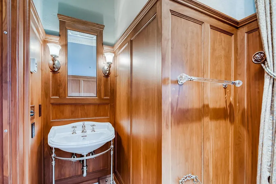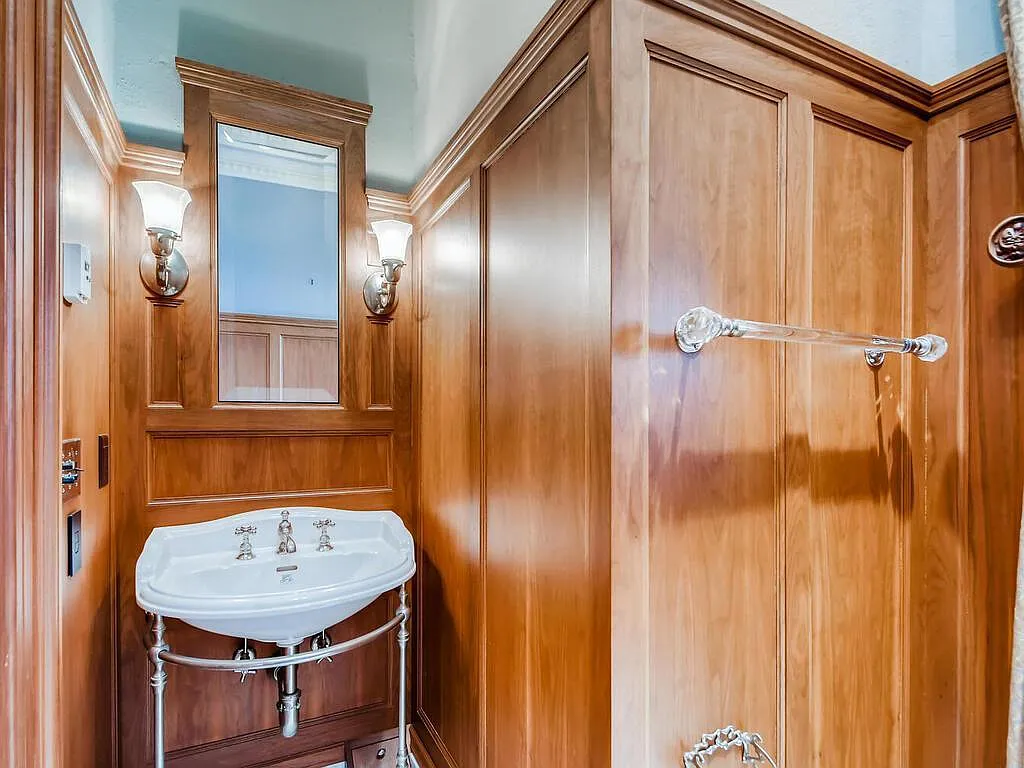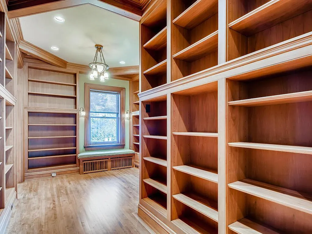 The study on the main floor was designed by a famous artist named Bradstreet. It has dark, rich wood and a quiet feel that makes you want to sit down with a good book and never leave. Every corner of these rooms has been restored with so much love, keeping the original woodwork and floors looking brand new.