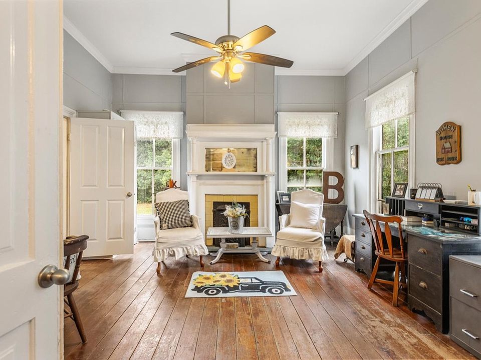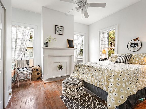 Six original fireplaces provide historic character throughout the home. Period details including original hardwood floors, banisters, and molding showcase the craftsmanship of the era. Downstairs also includes a family room off the kitchen, a full guest bath, and a primary suite with an attached bath and nearby laundry.