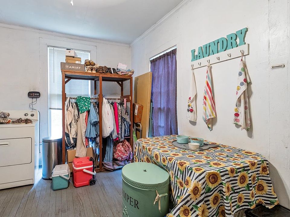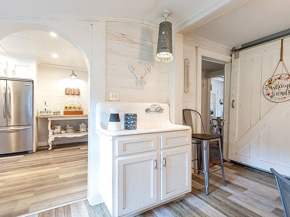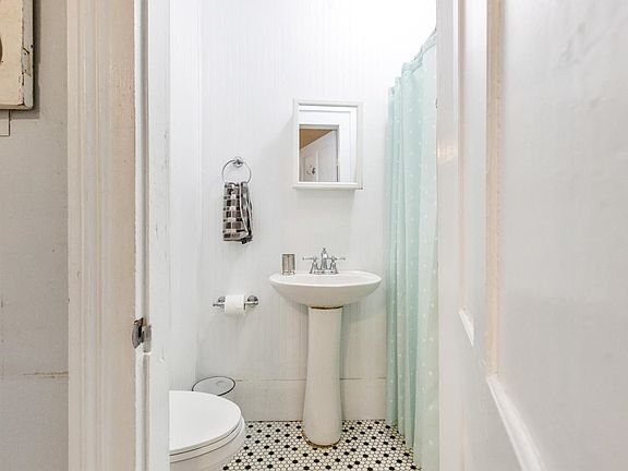 Inside, two front parlors flank the entry—one used as a living room and one with a closet allowing for modern use as a bedroom—and a traditional staircase leads upstairs to two bedrooms and a full bath. The large dining room has been opened to expose the original rafters, giving the space a bright and airy feel.