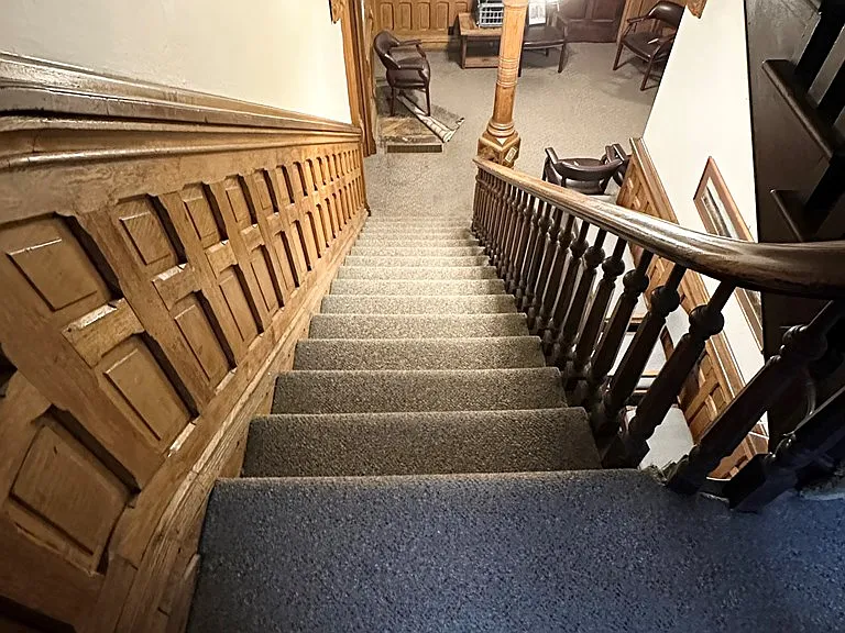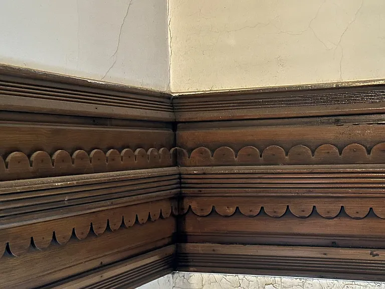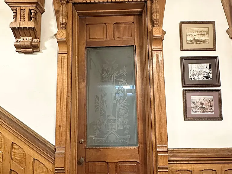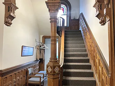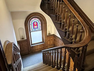 Throughout the interior, you will find exquisite features rarely replicated today. Original stained glass windows glow with color when the sun passes through, casting warm hues on the meticulously crafted wood trim. Elegant plaster crown molding spans multiple rooms, highlighting soaring ceilings and large gathering spaces. These elements serve not only as decorative touches but as living examples of historic artisanship.