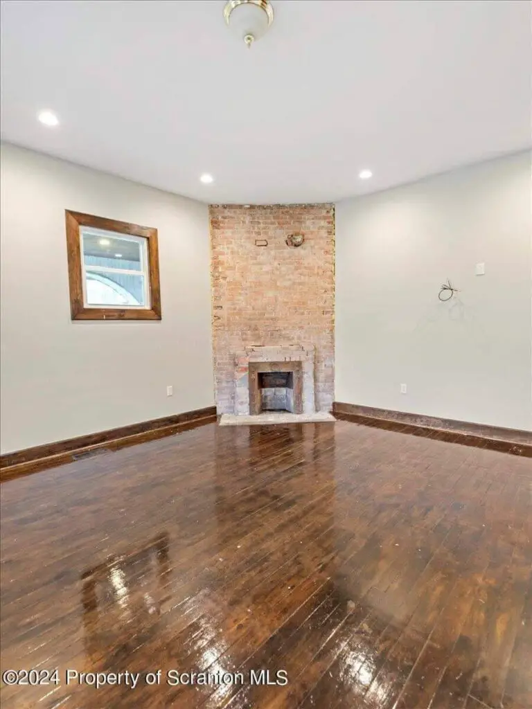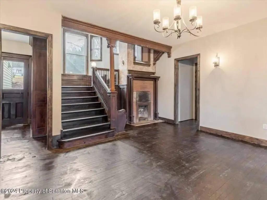 To one side lies the living room, a space designed for both gathering and quiet reflection. High ceilings give the room an airy sense of grandeur, while classic moldings and period features retain a sense of intimacy and warmth. A fireplace commands attention at the center, framed by decorative mantelwork that adds a touch of elegance. It’s the kind of space where one could easily envision holiday gatherings, evenings by the fire, or simply enjoying the view through tall windows that let in the soft Pennsylvania light.