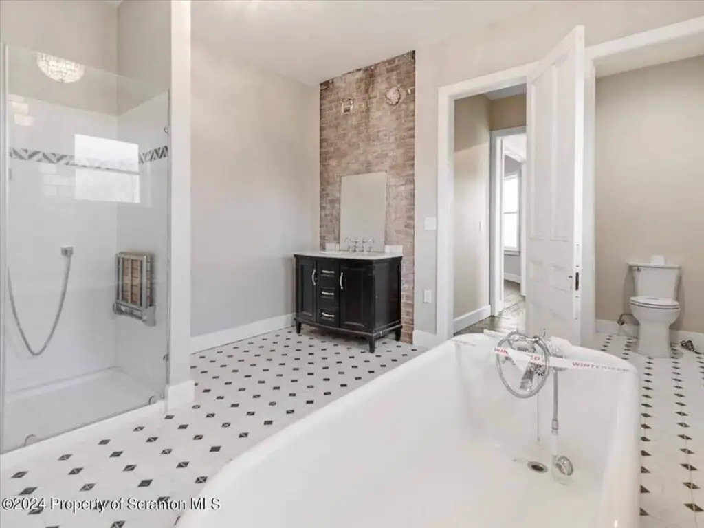 One of the most desirable features of this property is the full primary bedroom located on the main floor. Thoughtfully designed for both comfort and privacy, this suite combines spaciousness with style. Large windows bathe the room in natural light, while the adjoining modern bathroom adds a touch of luxury with updated fixtures and finishes. It’s a rare feature in homes of this vintage — an example of how the property has been carefully adapted to meet contemporary needs without compromising its historic integrity.