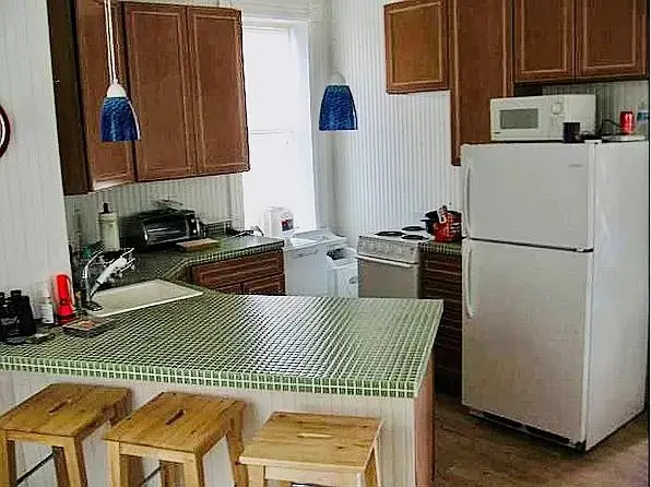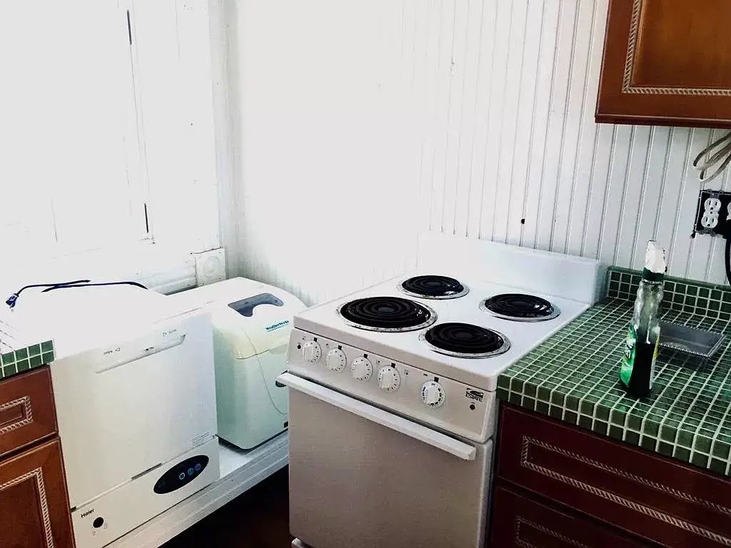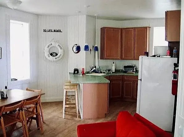 Inside, the main level offers a cozy yet surprisingly functional layout. A full kitchen features cherry cabinets, a breakfast counter, range, refrigerator, microwave, and portable dishwasher—modern amenities that make extended stays comfortable and convenient. The adjoining living and dining areas showcase the home’s character, with waterproof vinyl plank floors that complement the original trim, stairs, and doors. Beadboard walls add texture and warmth, while brick accents remind visitors of the structure’s durability and industrial beauty.