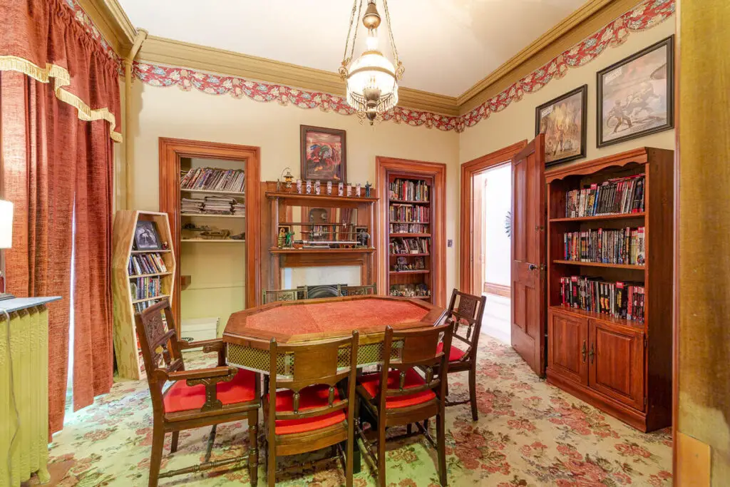 Further along, the library awaits, its walls lined with built-in shelves and period woodwork that speak to an era when the pursuit of knowledge was both an art and a pleasure. Every detail—from the hand-carved trim to the fireplace mantel—is a testament to the home’s exceptional preservation. Here, one can imagine long winter evenings spent by the fire, surrounded by leather-bound volumes and the gentle crackle of burning logs.