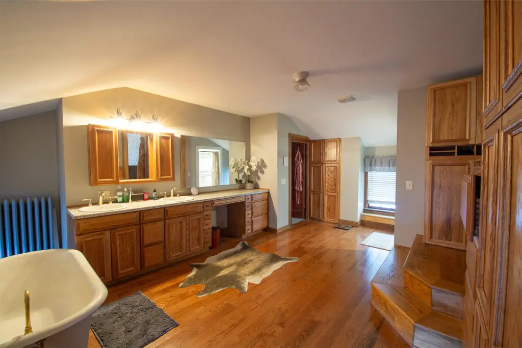 The primary suite, a showpiece of historic design and modern function, provides an expansive layout and tranquil ambiance. Large enough to accommodate a sitting area or reading nook, the room balances elegance and comfort perfectly. The adjoining bath offers all the modern amenities one could wish for while maintaining the home’s sense of character and continuity.