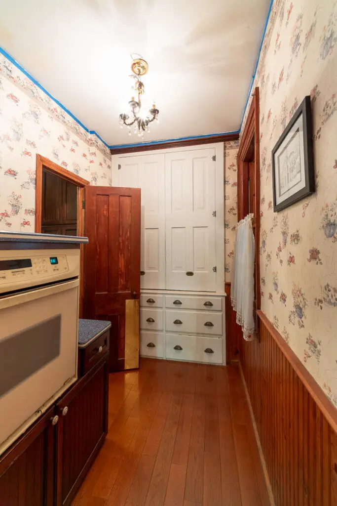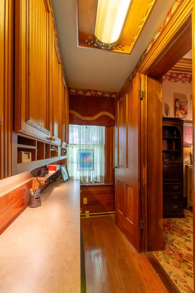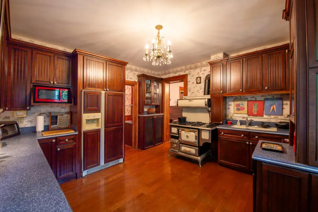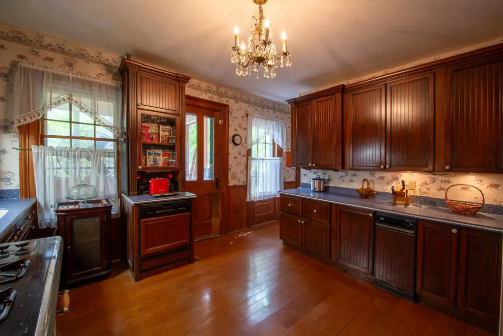 At the end of the main hall, the home transitions seamlessly into a large, updated kitchen—proof that modern convenience and historic integrity can coexist beautifully. The kitchen has been thoughtfully redesigned with custom cherry cabinetry and Corian countertops, offering both beauty and durability. Every element feels intentional, from the cabinetry’s rich finish to the gleam of contemporary appliances. Yet the space retains its period charm, thanks to details like the adjoining butler’s pantry—a delightful reminder of the home’s original design for formal entertaining.