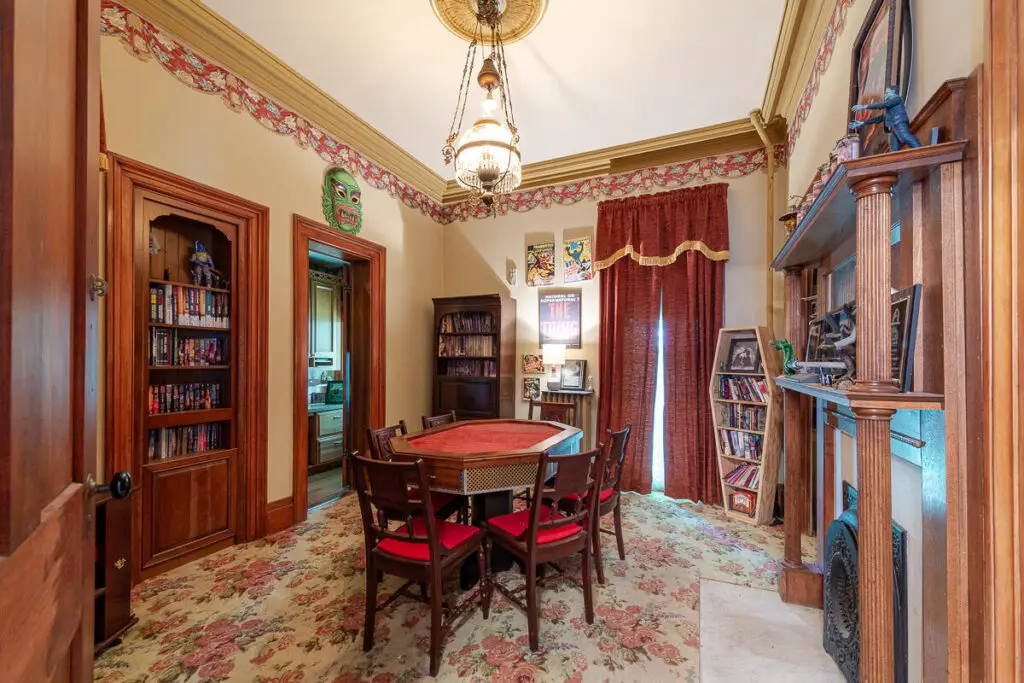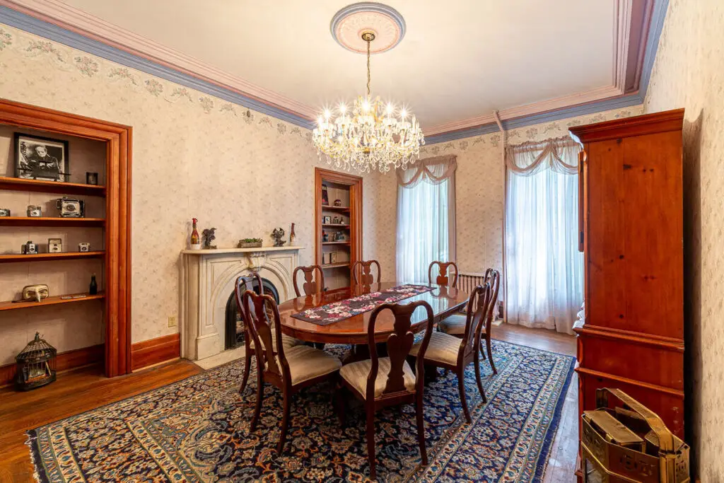 Beyond the library lies the formal dining room, a space designed for elegance and celebration. High ceilings and generous proportions create a sense of openness, while the soft glow of light fixtures illuminates the room’s many architectural features. Whether hosting an intimate dinner or a festive holiday gathering, this dining room offers the perfect blend of historical atmosphere and timeless sophistication.
