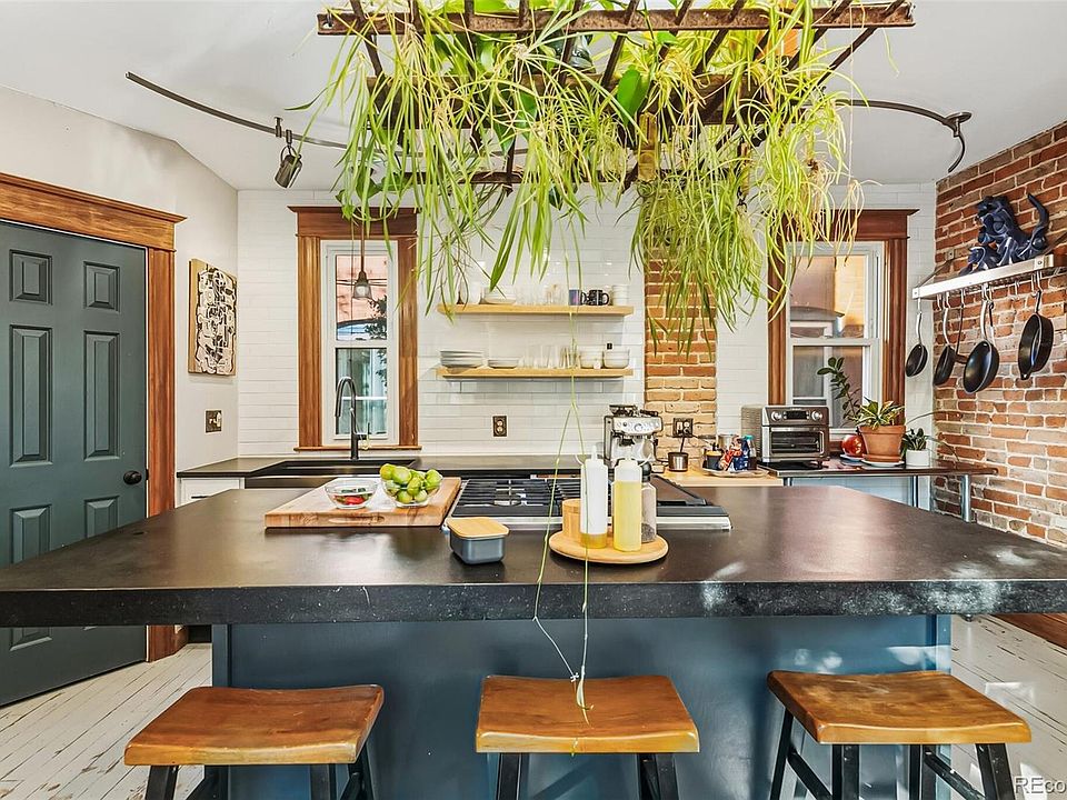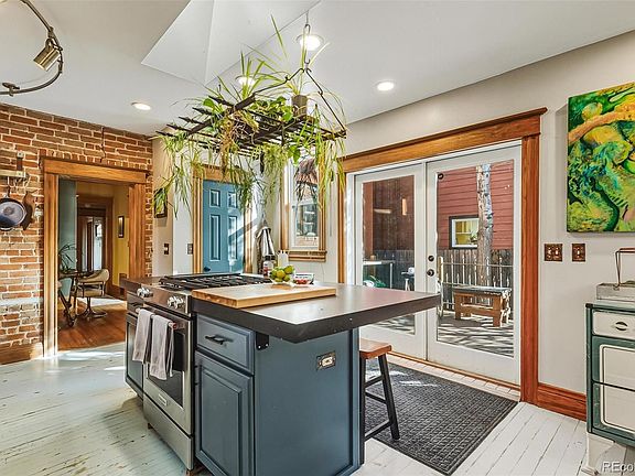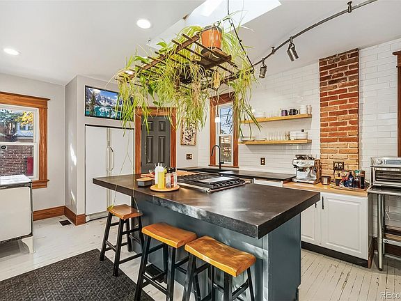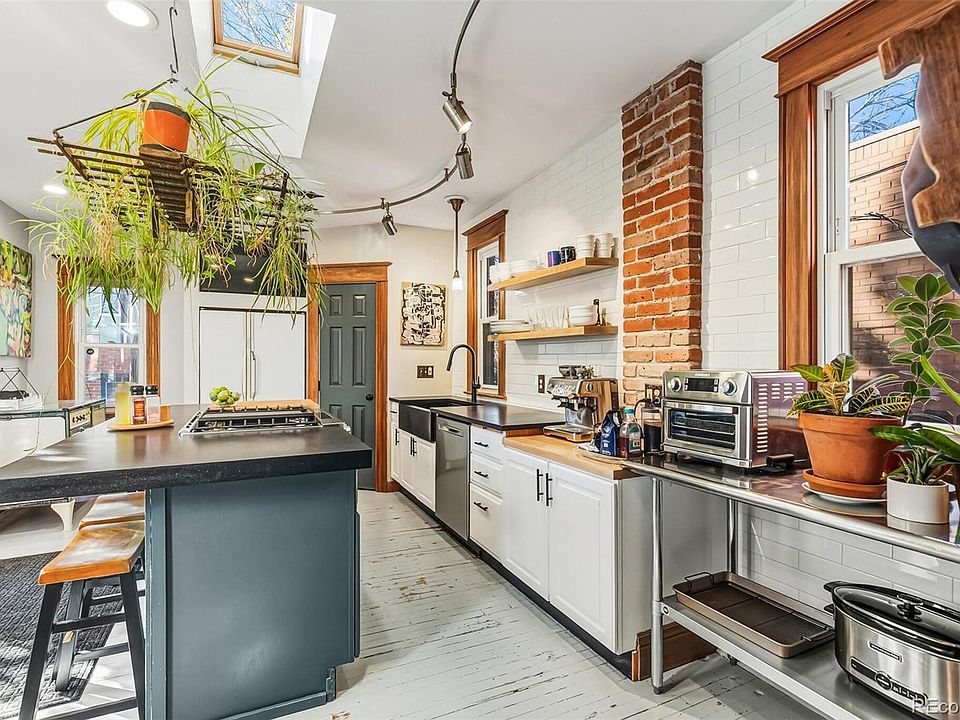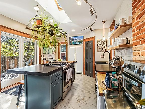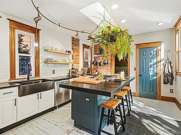 The main floor starts with a lovely parlor featuring an original fireplace. It’s the perfect spot to sit with a book on a snowy Denver afternoon. While the front of the house feels wonderfully vintage, the kitchen has been updated to be a modern dream. It features a bright skylight, a large pantry for all your snacks, and sleek cabinets that fit the old-fashioned style perfectly.