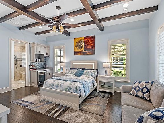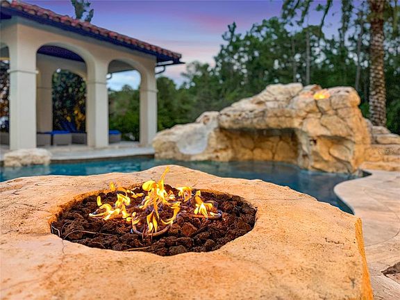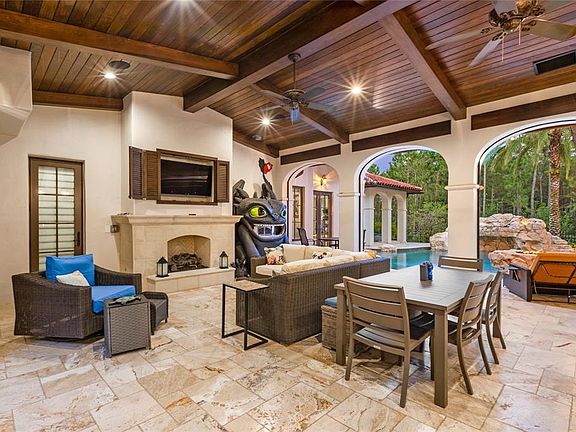 The outdoor space is just as incredible as the inside. The pool looks like something you would find at a five-star hotel. It has a grotto, a rock waterfall, a slide, and a spa. There are multiple fire pits where you can sit and tell stories under the stars, plus a full outdoor kitchen for summer barbecues. The master suite on the first floor is a dream retreat. It has two of its own fireplaces and a sitting area that looks right out over the pool. It is the perfect spot to relax after a long day in the parks. For guests, there is even a separate apartment over the garage so they can have their own private space.