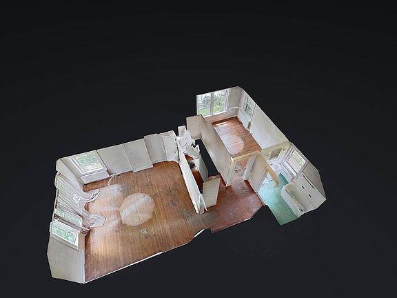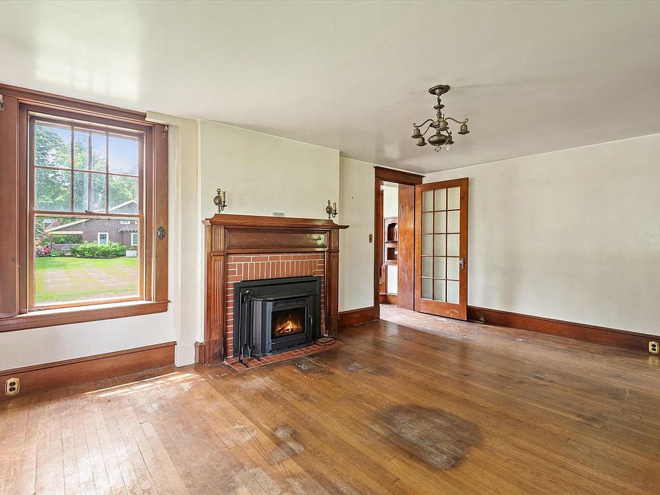 Inside, the house feels like a time capsule in the best way possible. Many of the original finishes and trims are still there, untouched by trendy renovations that often strip away a home’s personality. The layout is cozy and simple, with a kitchen, dining room, and living room on the first floor. Large windows let in plenty of light, highlighting the wood and tile floors that run through the home.