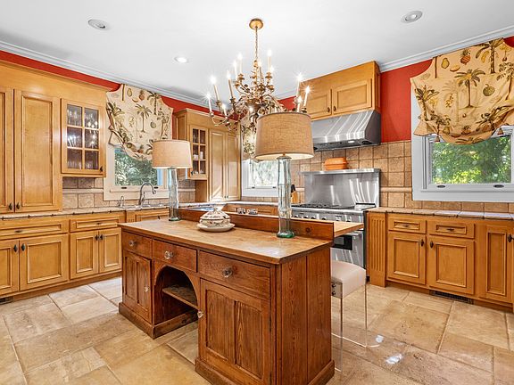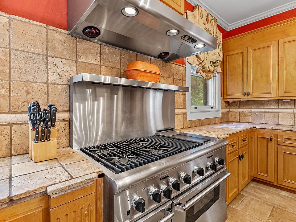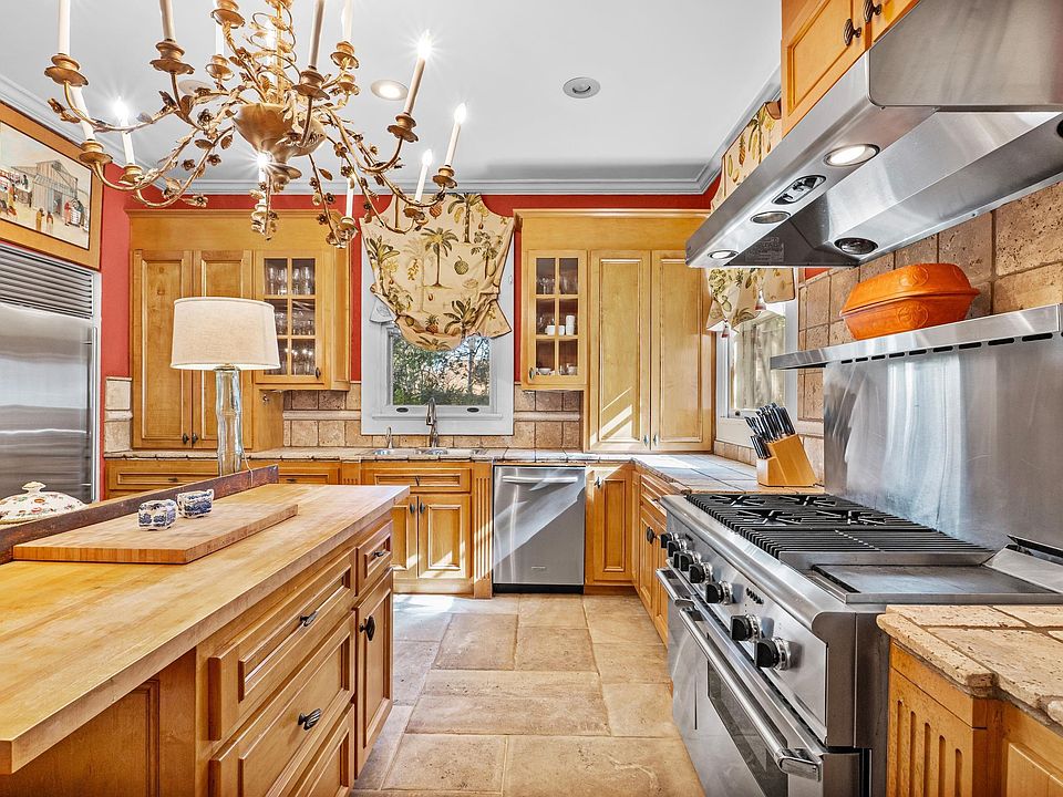 - Kitchen: Eat-in kitchen featuring Thermador appliances, gas cooktop, double ovens, kitchen island, and a separate pantry.