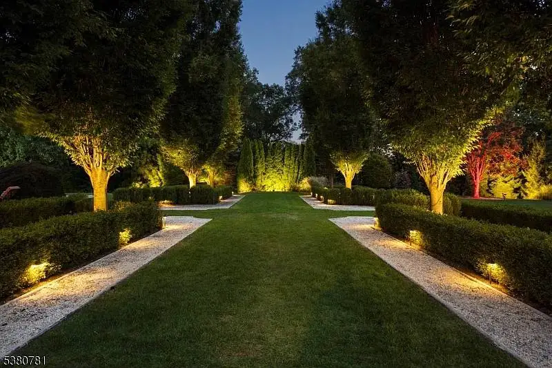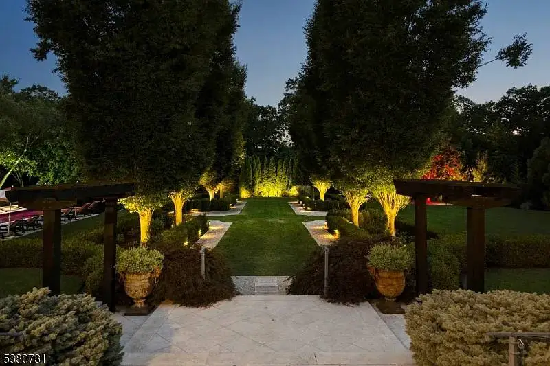 Stepping outside, the estate’s two acres unfold in a series of manicured gardens, terraces, and lawns that reflect the same level of care as the interior. The landscaping is a study in geometry and grace, combining symmetry with organic flow. Mature trees provide privacy, while carefully placed lighting ensures the grounds are as enchanting by night as they are by day. The property’s scale allows for the inclusion of numerous outdoor amenities—a pool, cabana, or sports court could easily be envisioned—without ever compromising its sense of openness.