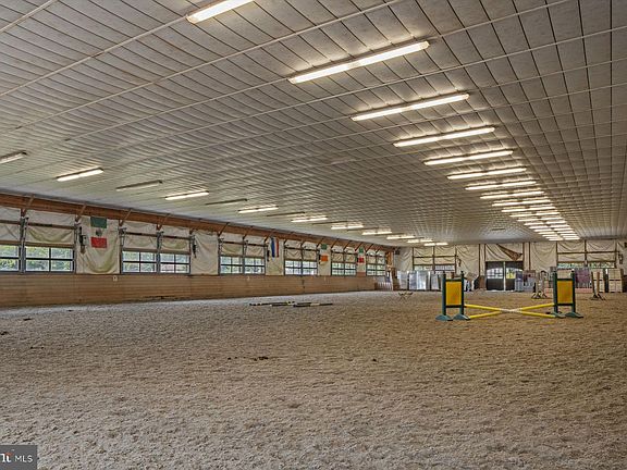 Above the barn, a beautifully appointed three-bedroom apartment offers full living accommodations, complete with a kitchen featuring Sub-Zero appliances. This space is ideal for staff, guests, or visiting equestrians. Directly adjacent, a magnificent 80-by-180-foot indoor riding arena provides a world-class training environment. The arena features GTT fiber footing, oversized garage-style doors for natural ventilation, and a heated eight-car garage attached, perfect for storing equipment or vehicles.