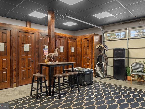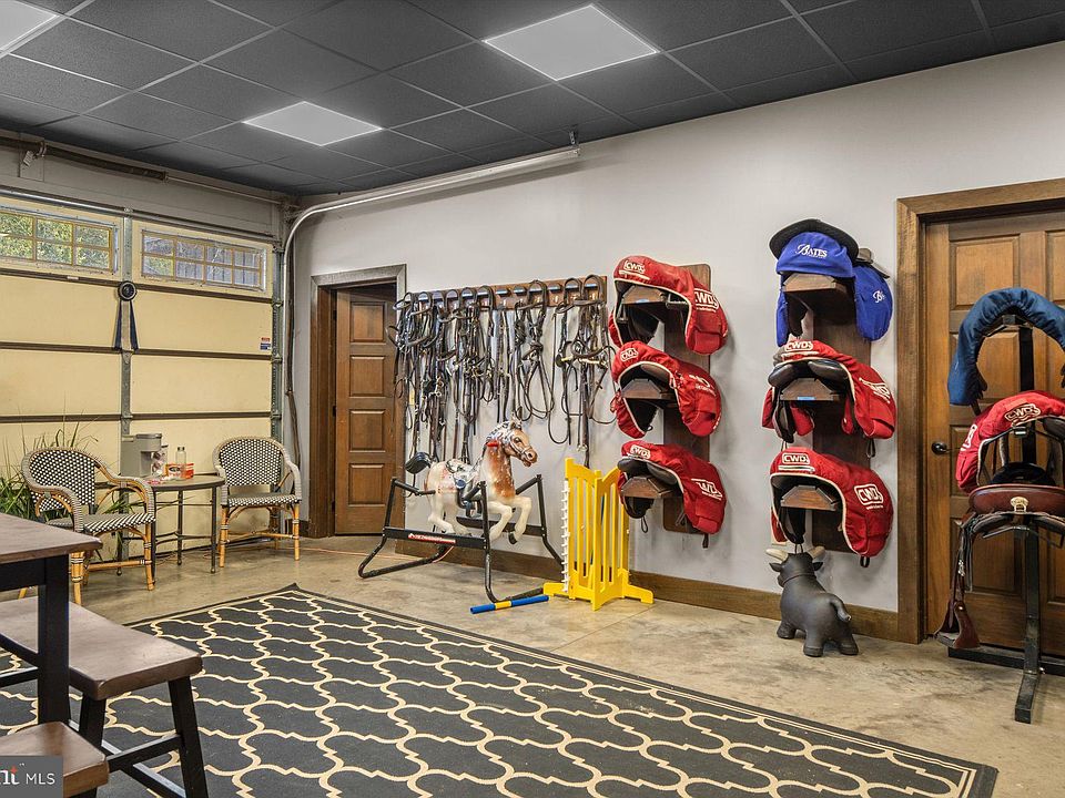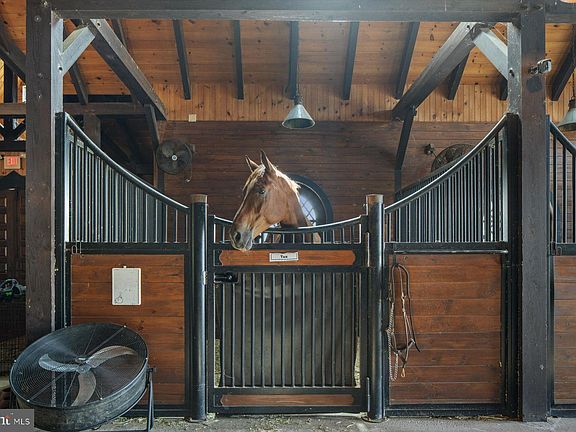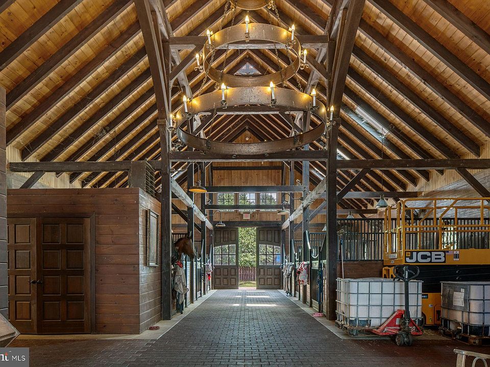 Beyond the main residence lies the heart of the estate—its exceptional equestrian facilities. The European-style barn, custom-built by B&D Builders, exemplifies the same level of craftsmanship and detail found in the main home. Inside are ten 12-by-12 stalls, each equipped with automatic Nelson waterers, radiant heated floors, and two indoor wash stalls with hot and cold water. Dual coal-fired blowers ensure comfort during colder months, while two outdoor wash stalls add convenience. The barn also includes a tack room with ten lockers, a large storage room, and a laundry area.