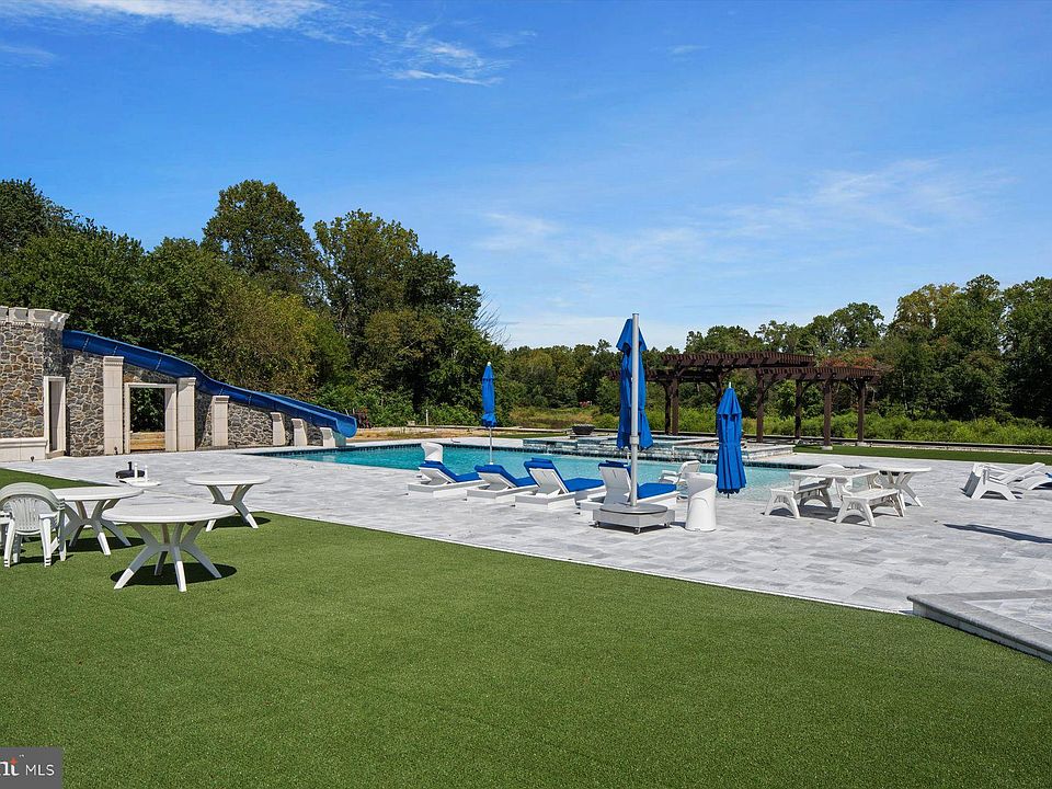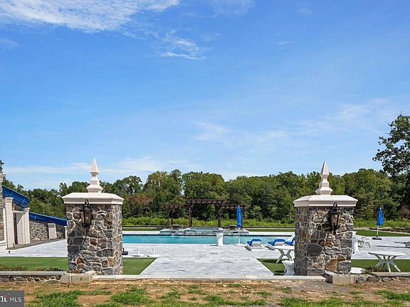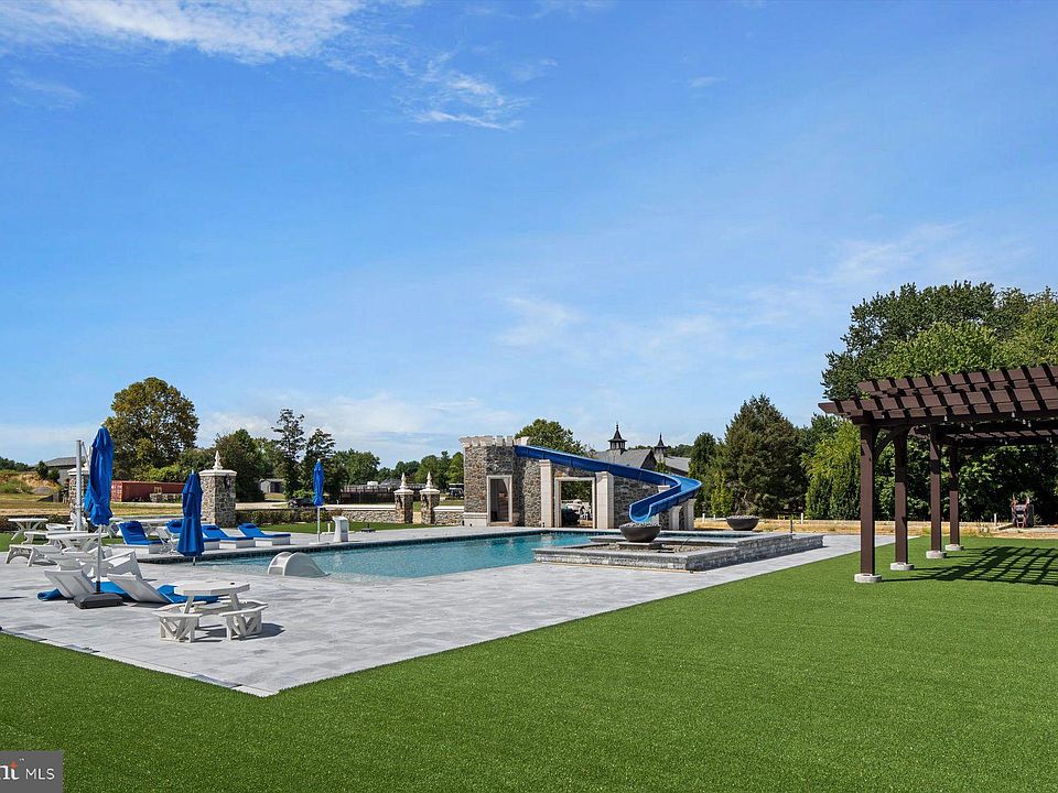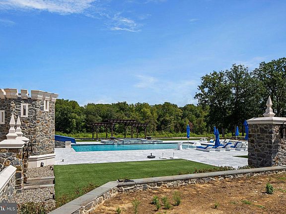 The seamless integration of indoor and outdoor living defines this property. Multiple French doors lead from the great room and dining spaces to an expansive brick patio that wraps around the house. Here, the resort-style saltwater pool takes center stage, complete with a waterfall feature, hot tub, and custom slide. Designed for both relaxation and recreation, the pool area includes infrastructure for a future pool house and bocce ball court, offering endless opportunities for entertainment and leisure.