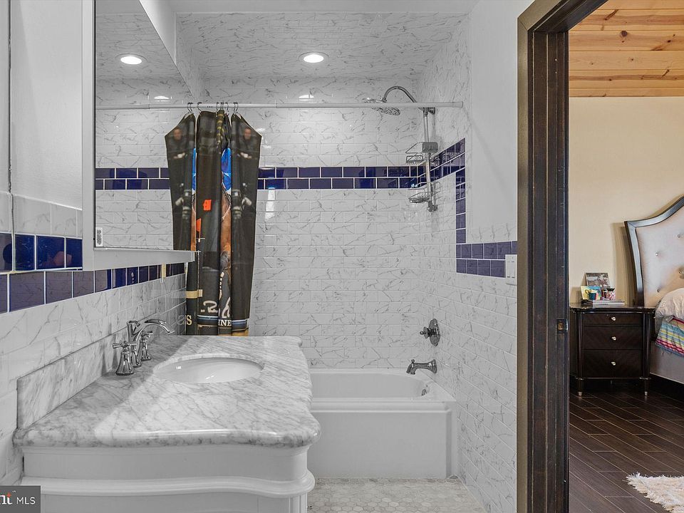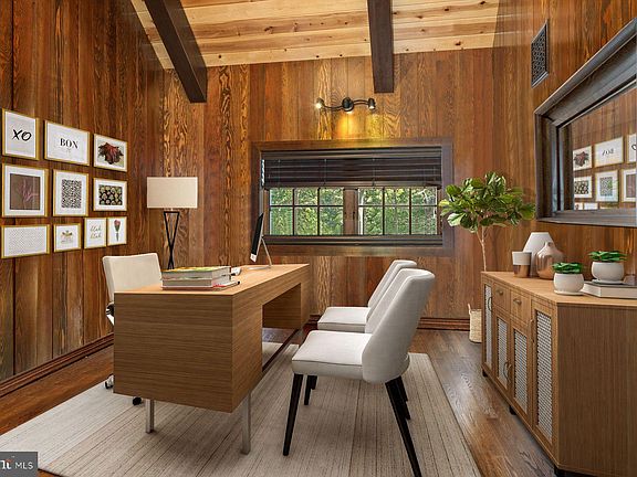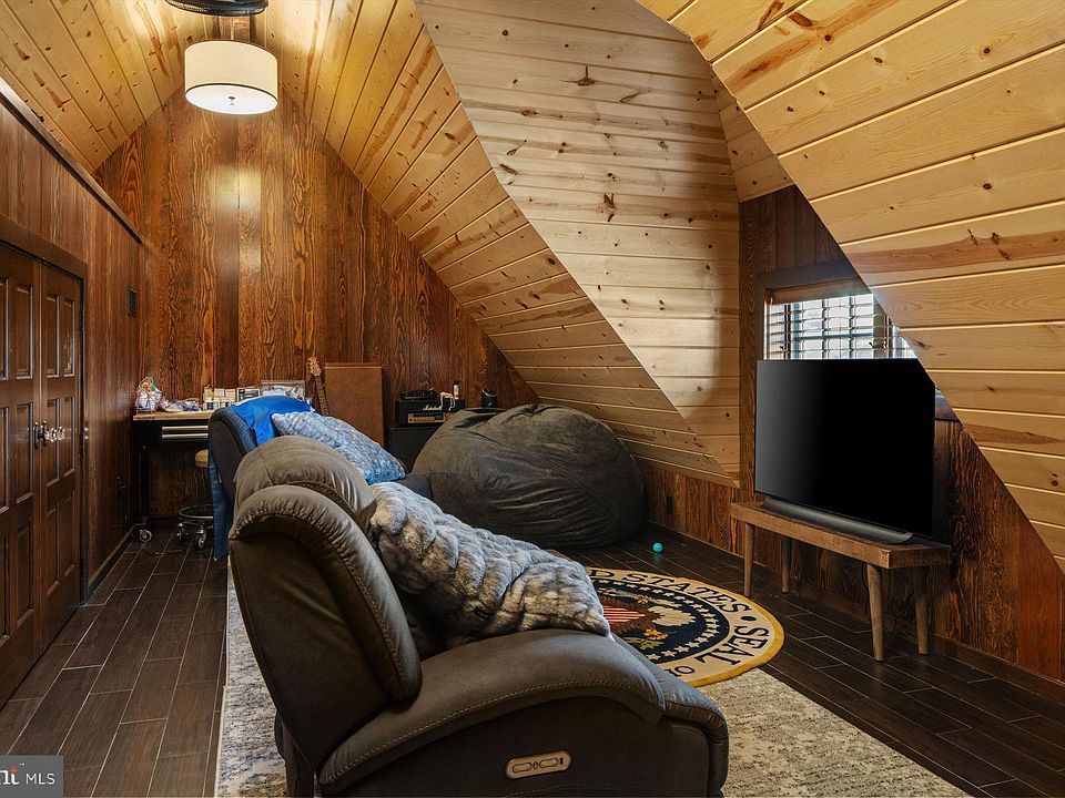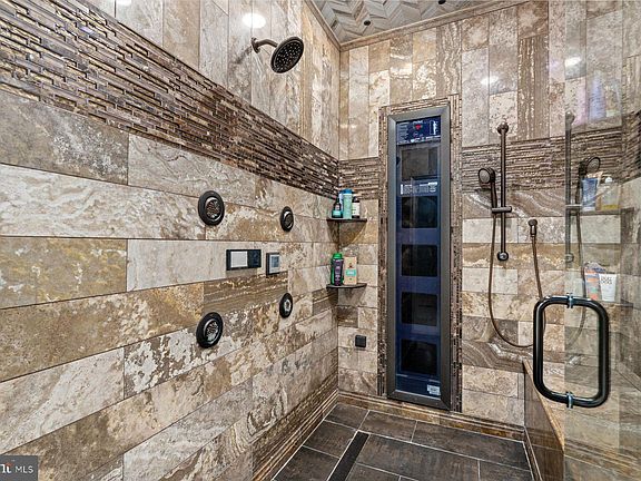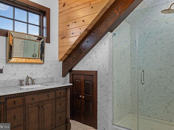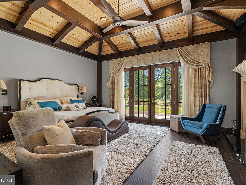 On the main level, the primary suite is tucked away in its own private wing, offering a tranquil retreat. The spacious bedroom features a stone woodburning fireplace, cathedral ceiling, and access to an outdoor oasis complete with a covered pergola and a Michael Phelps swim spa. The ensuite bathroom is spa-like in every sense, featuring an antique soaking tub, walk-in shower with jets, steam, and tanning capabilities, along with a custom walk-in closet designed for luxury and function.