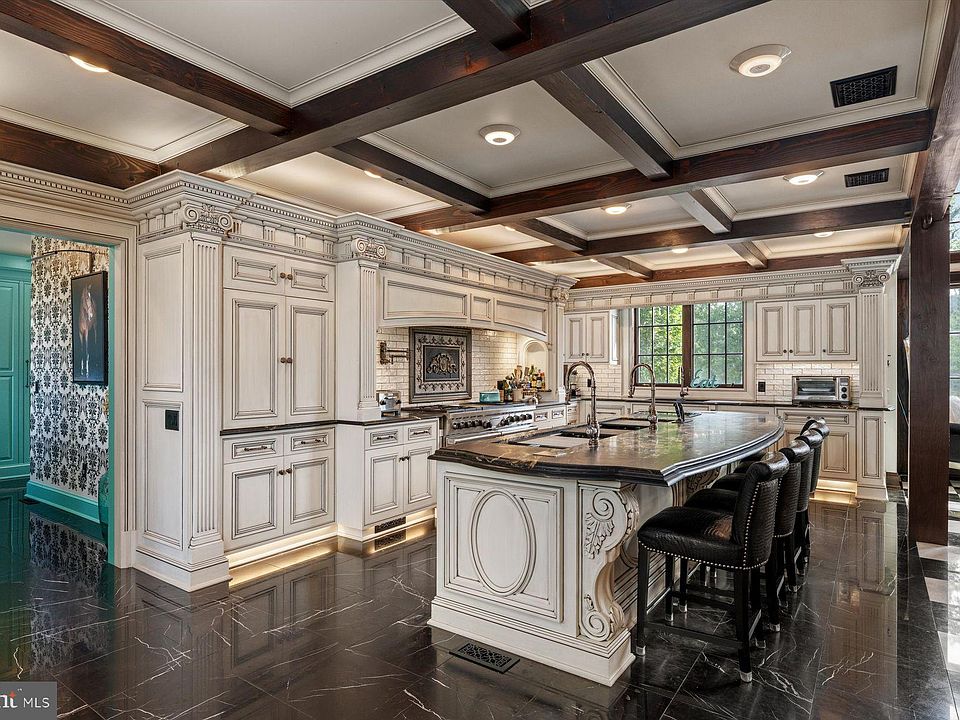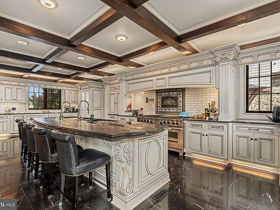 The grand entryway opens into a spectacular great room where natural light floods through expansive windows, highlighting Italian marble floors, soaring cathedral ceilings, and exposed beams that echo the rustic charm of a European mountain lodge. A magnificent woodburning fireplace anchors the room, creating a warm and welcoming space ideal for both intimate evenings and grand entertaining. The open floor plan allows the great room to flow effortlessly into the state-of-the-art kitchen—a chef’s dream outfitted with Wolf appliances, granite countertops, custom cabinetry, and an impressive 12-foot island that doubles as a social centerpiece.