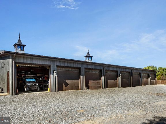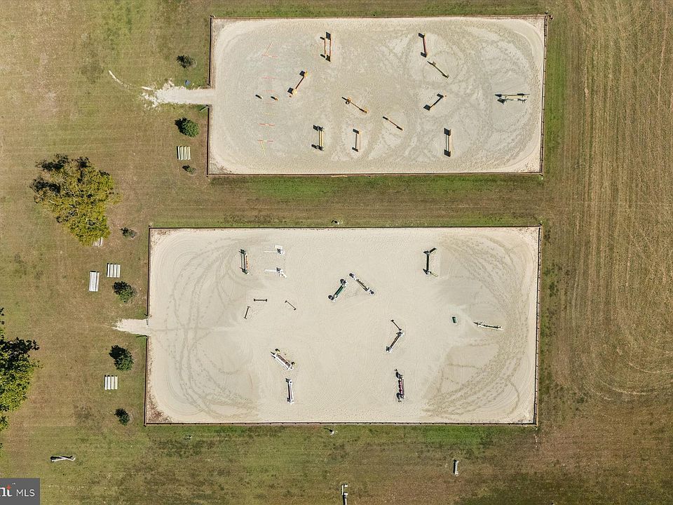 The equestrian amenities continue outdoors with two large sand arenas—one 200-by-200-foot space ideal for jump courses and flatwork, and another 180-by-200-foot arena designed for dressage or versatility training. The estate also includes two 40-by-40-foot stallion paddocks, six additional paddocks with run-in sheds, and each one fitted with Nelson heated waterers for year-round use. A large open pole barn and a detached garage/storage shed provide additional utility, while a secondary gated entrance ensures privacy and convenience for the equestrian facilities.