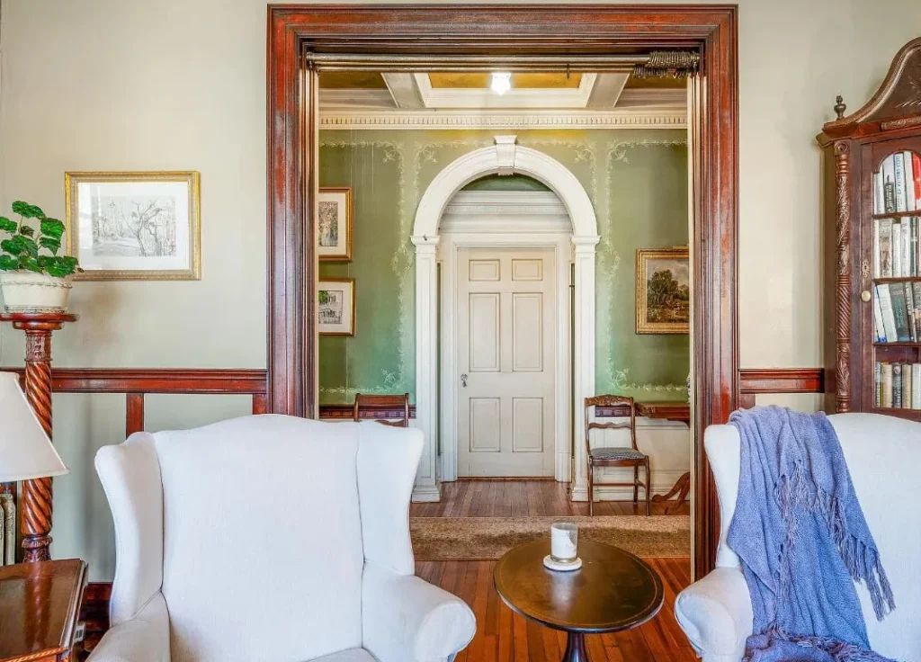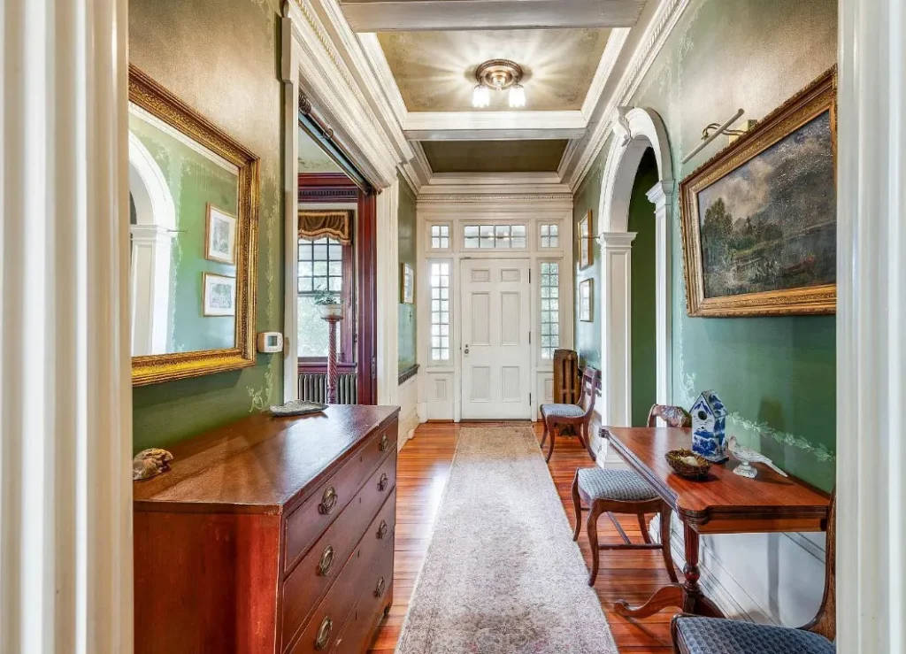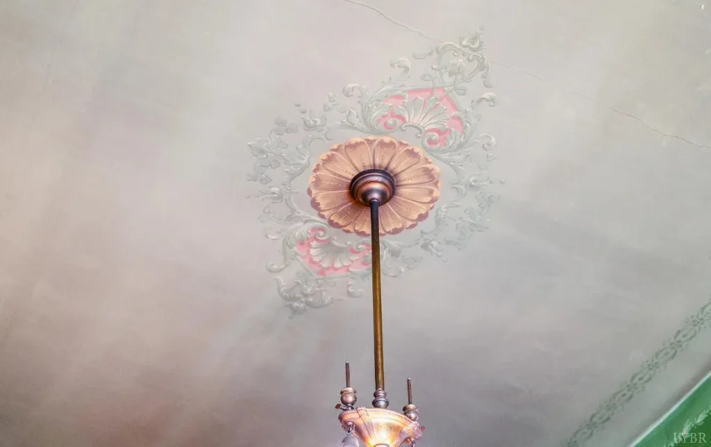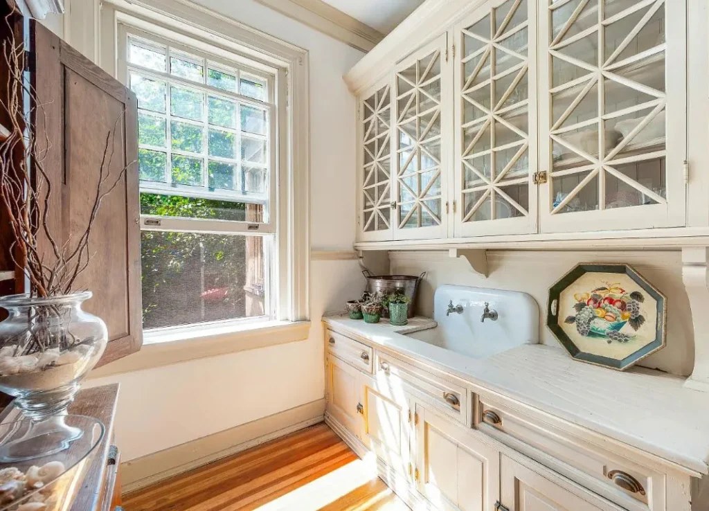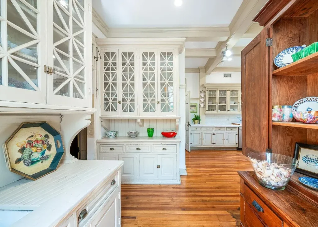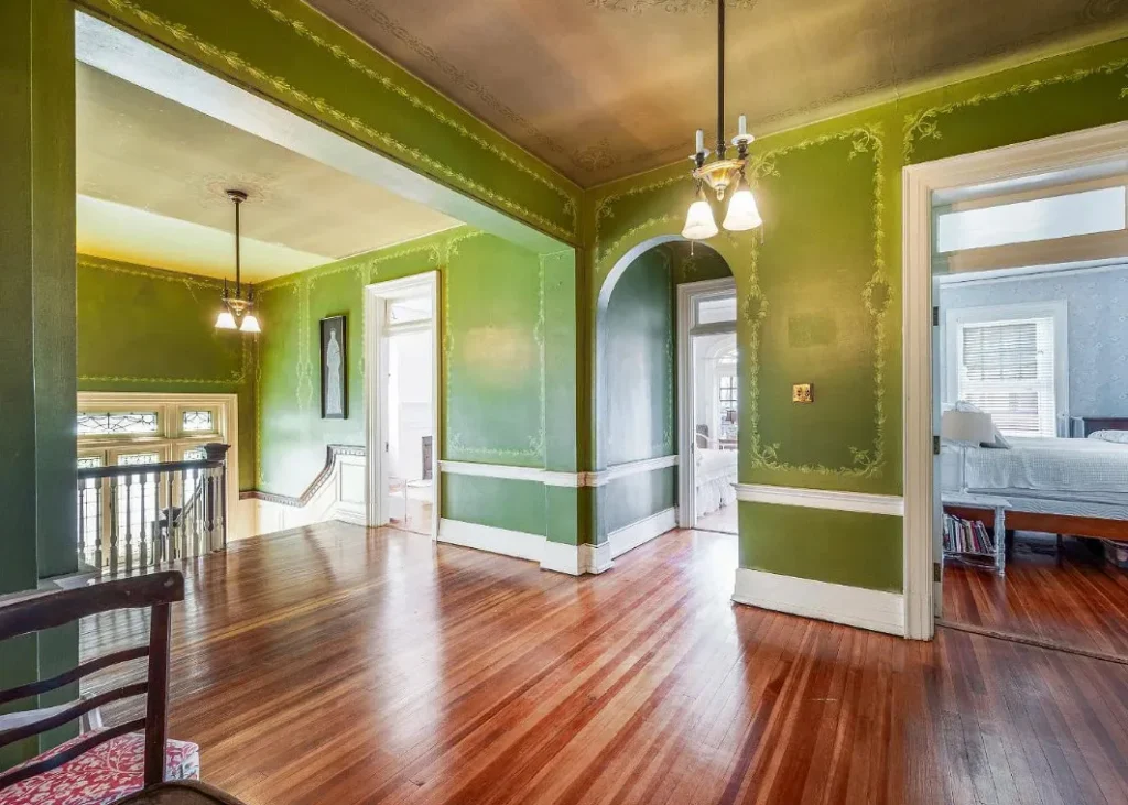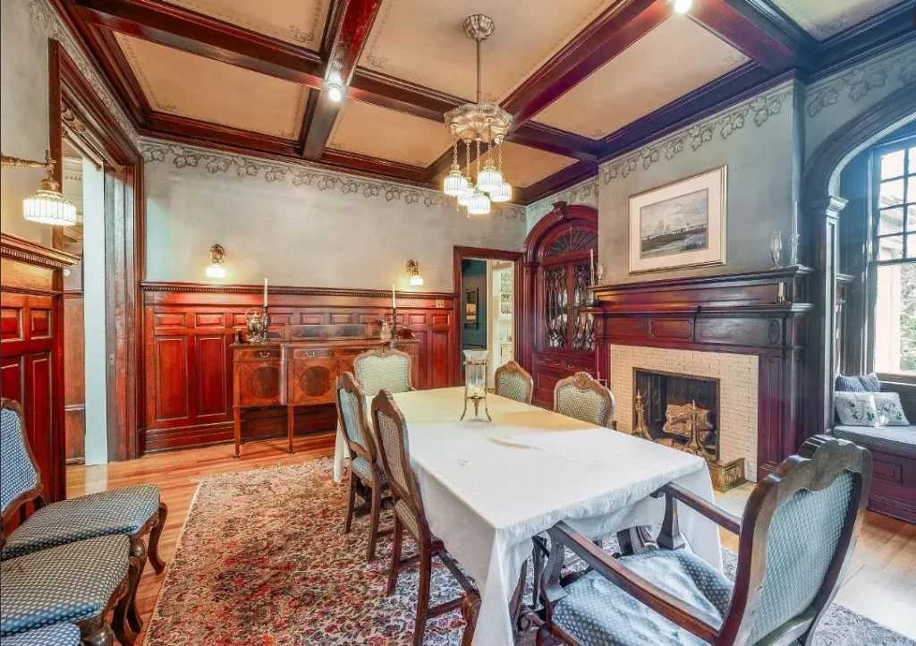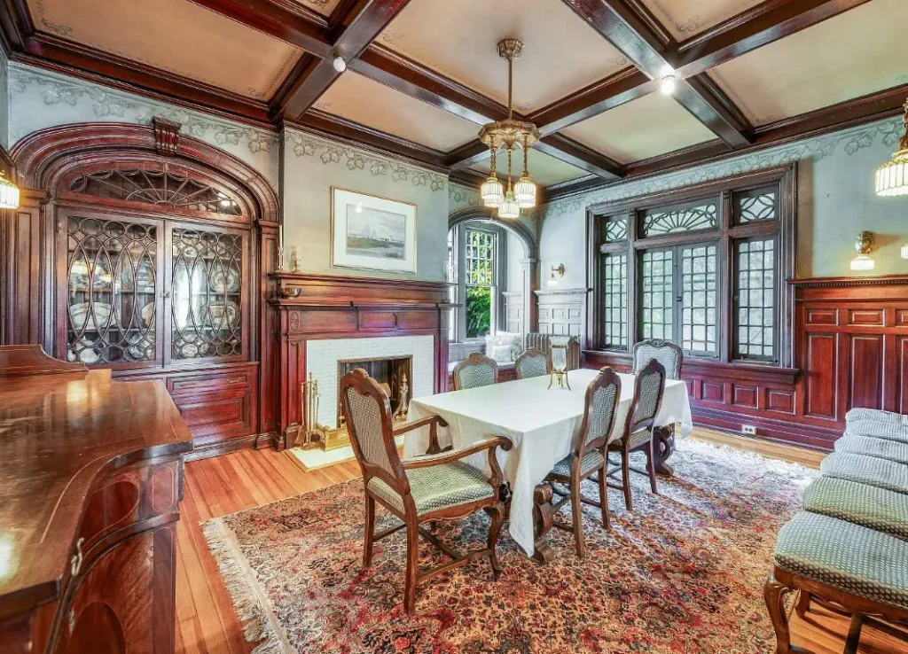 The home’s interior spaces feel warm and inviting while maintaining a stately elegance. The formal living and dining rooms are adorned with original stenciling and hand-painted murals — stunning artwork that gives each space its own personality. Ornate light fixtures, including matching sconces and ceiling pieces, add a golden glow to the historic wood tones. The kitchen features three large butler’s pantry cabinets, preserving the charm and functionality of its original design.