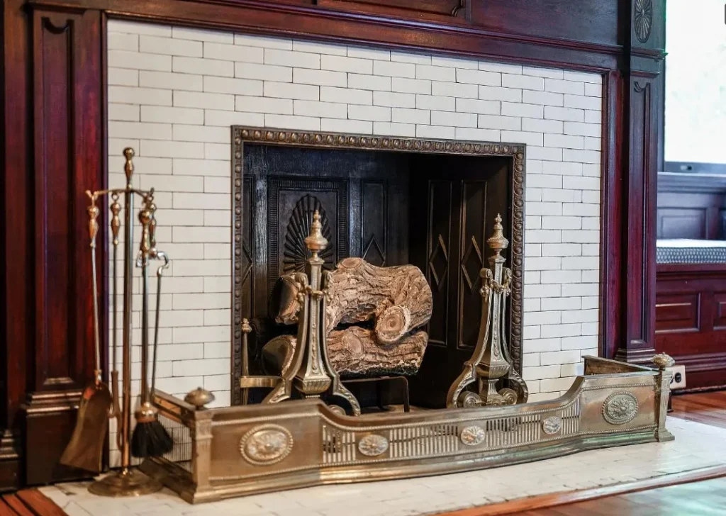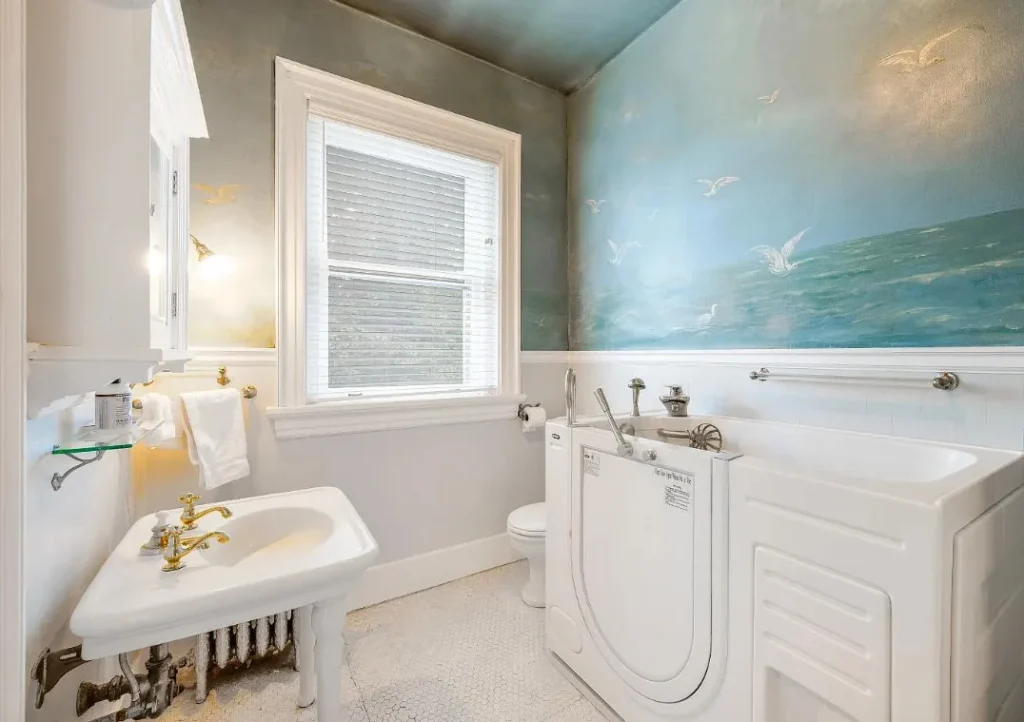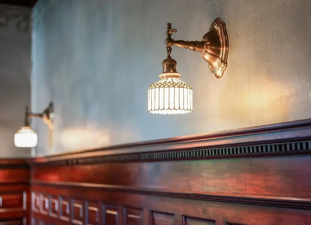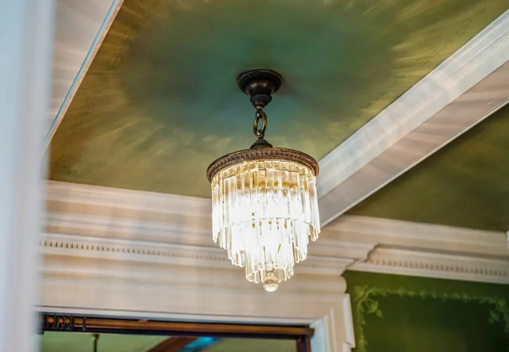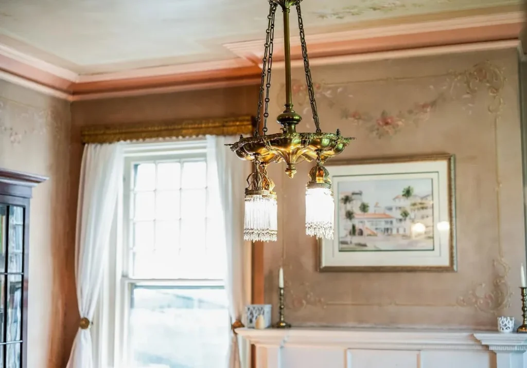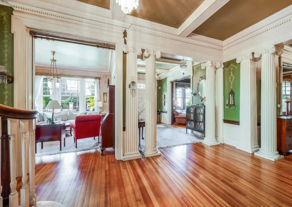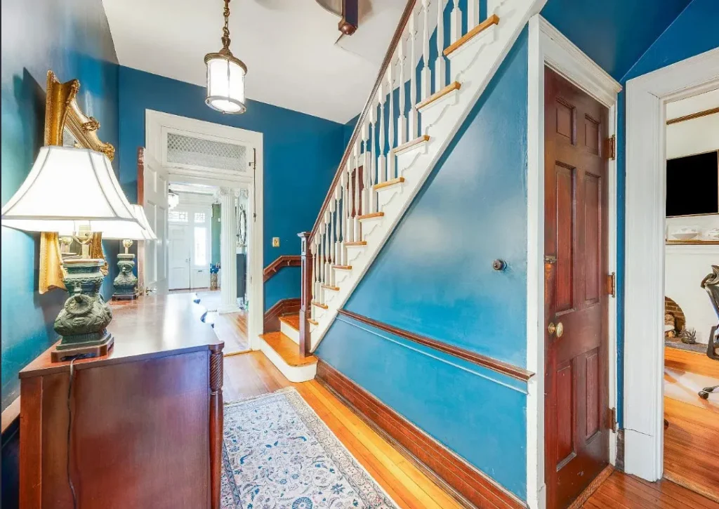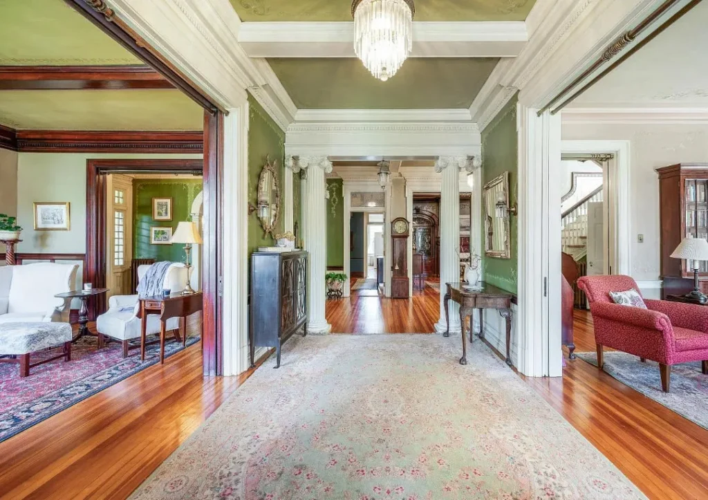 The home’s interior spaces feel warm and inviting while maintaining a stately elegance. The formal living and dining rooms are adorned with original stenciling and hand-painted murals — stunning artwork that gives each space its own personality. Ornate light fixtures, including matching sconces and ceiling pieces, add a golden glow to the historic wood tones. The kitchen features three large butler’s pantry cabinets, preserving the charm and functionality of its original design.