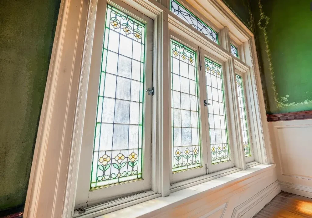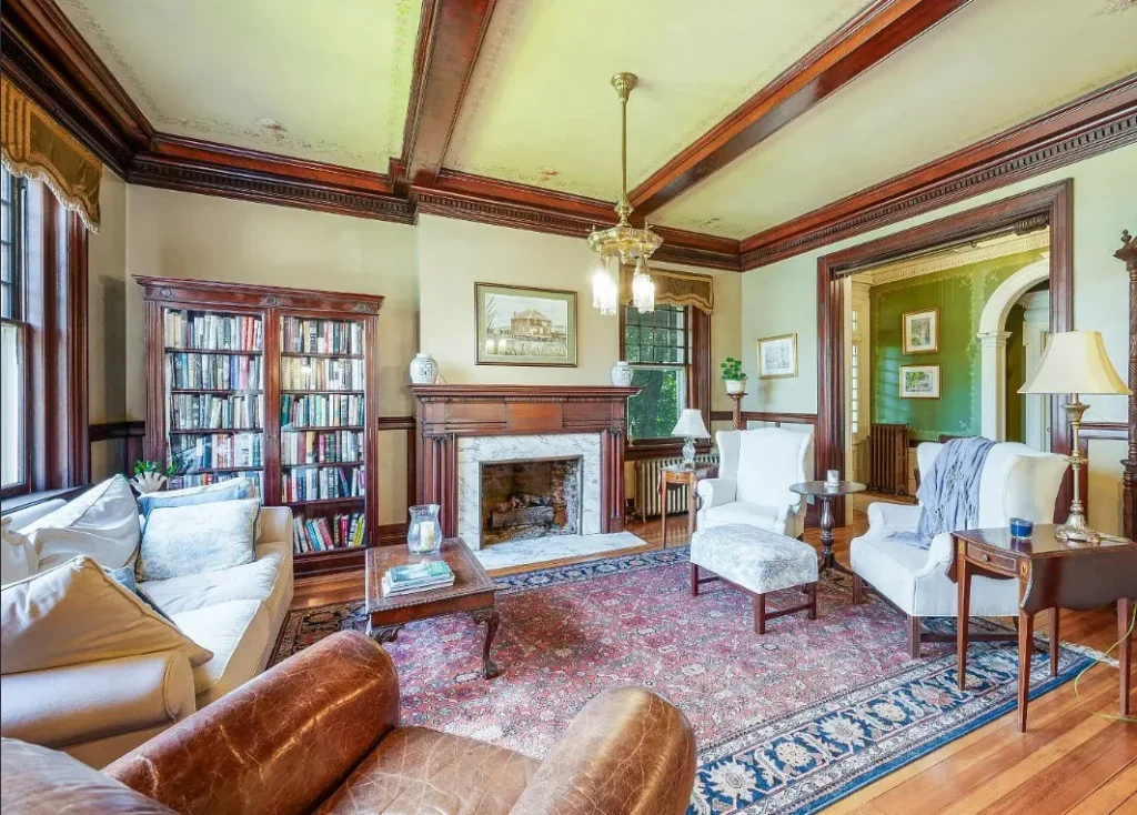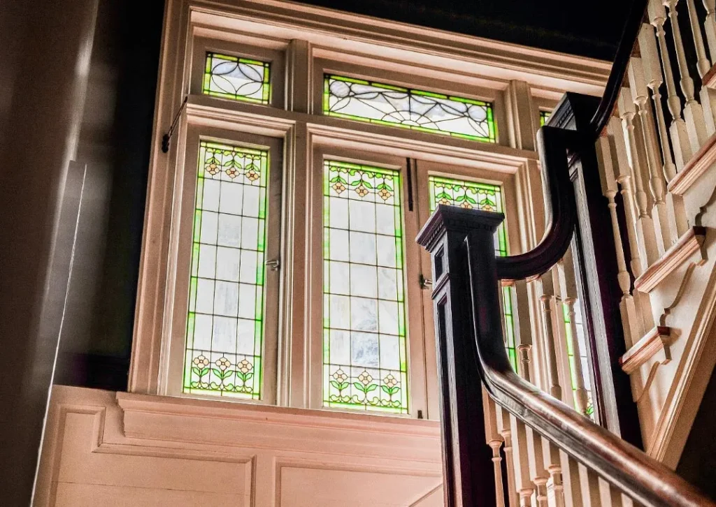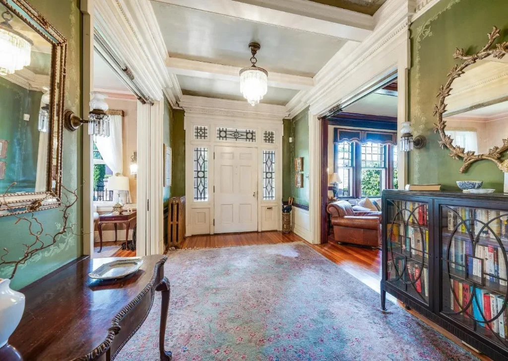 Inside, the home reveals a world of original craftsmanship rarely seen today. Nearly every detail remains beautifully intact — from the unpainted woodwork to the coffered ceilings and pocket doors. Crown moulding, wide baseboards, chair rails, and original mantels showcase the artistry and attention to detail of its era. Hardwood floors run throughout, and natural light floods in through large windows and pieces of exquisite stained glass.