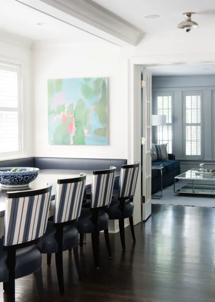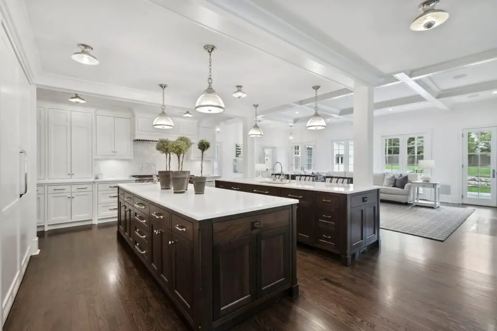 The kitchen, a true showpiece, exemplifies the seamless blend of functionality and beauty that defines high-end design. With double islands topped in marble, bespoke white cabinetry, and a hidden pantry, the space invites both culinary creativity and convivial gathering. Professional-grade appliances, including an eight-burner Wolf range and integrated Sub-Zero refrigerator, ensure that the kitchen performs as beautifully as it looks. An impressive built-in banquette offers the perfect spot for family breakfasts or casual dinners, while pendant lighting and fine finishes create a sense of timeless sophistication. The flow between the kitchen and adjoining living spaces makes this home ideal for both grand entertaining and quiet everyday moments.
