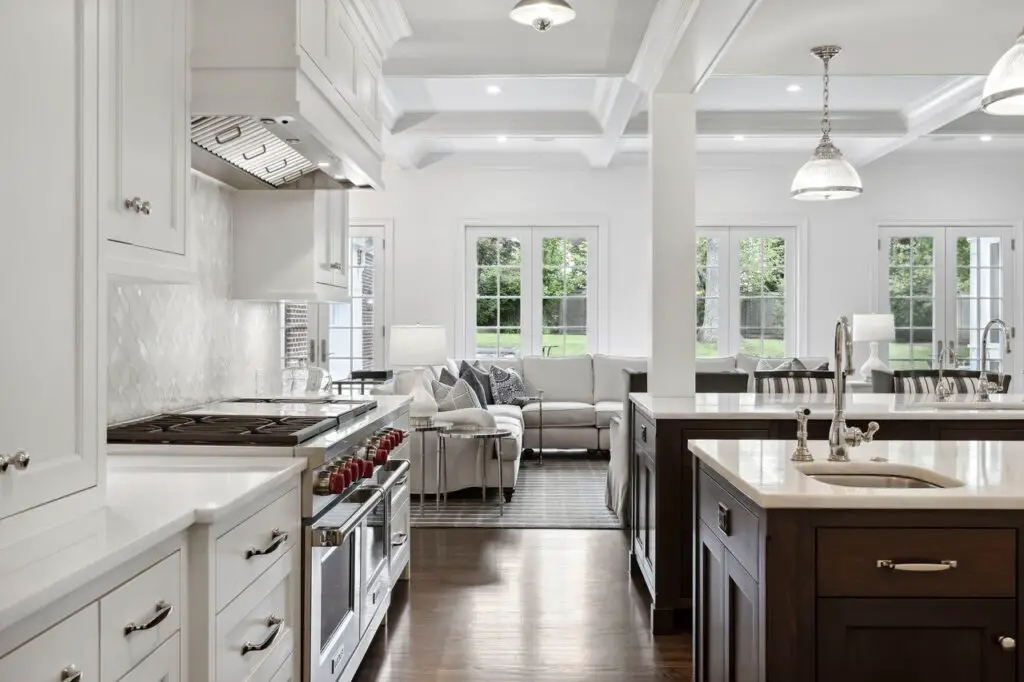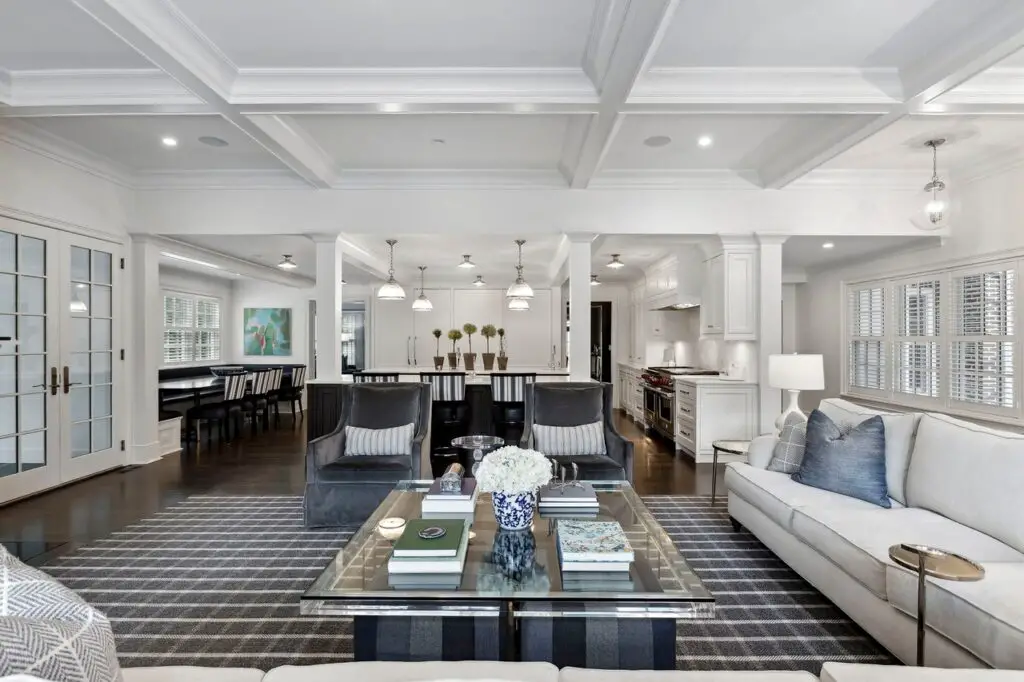 Beyond the preserved formal rooms lies a stunning addition designed for open-concept living. Here, a sun-drenched family room takes center stage, defined by 10-foot, 4-inch coffered ceilings and an entire wall of French doors that open to the beautifully landscaped backyard. This space perfectly captures the evolving spirit of luxury — open, airy, and designed for connection. It’s easy to imagine laughter echoing through these rooms during holidays, much like the scenes that first made the home famous, but now framed by an atmosphere of modern elegance and tranquility.