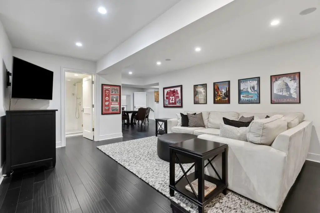 A secondary family room tucked just off the kitchen offers a more intimate retreat, perfect for reading, movie nights, or relaxed conversation. The interplay between formal and informal spaces throughout the home demonstrates a thoughtful approach to design — one that recognizes the need for both grandeur and warmth.