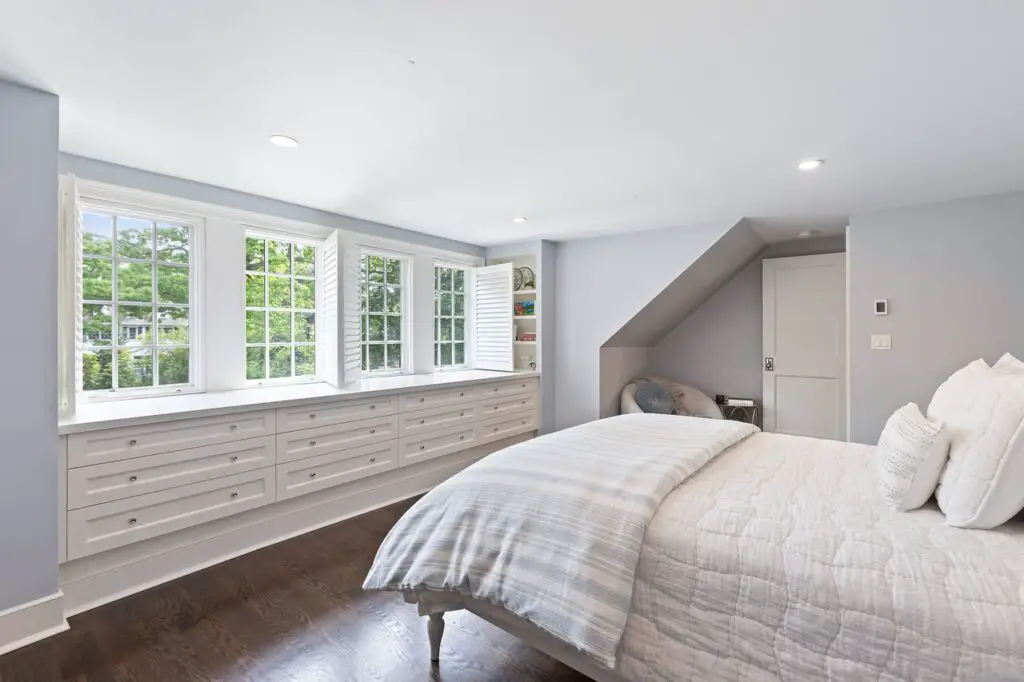 The additional bedrooms, all spacious and bright, include en suite bathrooms and generous closets. Each has been designed with an eye toward comfort, blending traditional detailing with subtle modern updates. Throughout the upper levels, natural light filters through original window frames, highlighting the continuity between old and new — a dialogue between eras that defines the entire home.