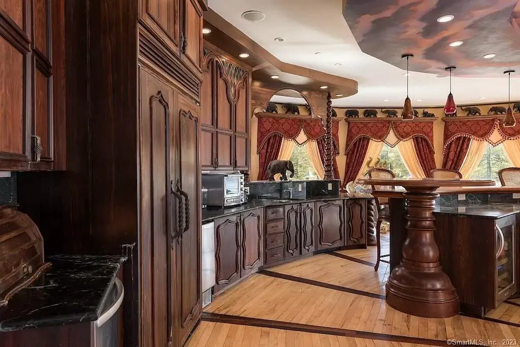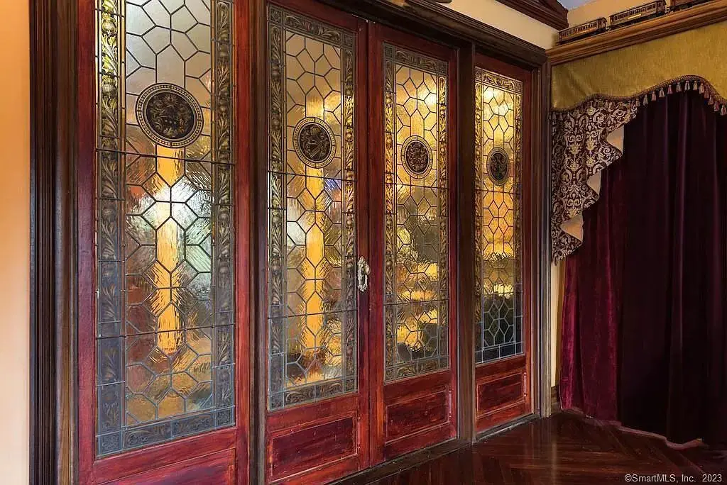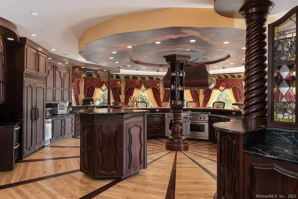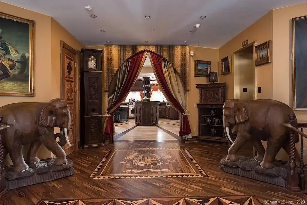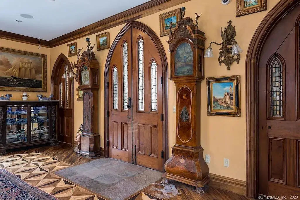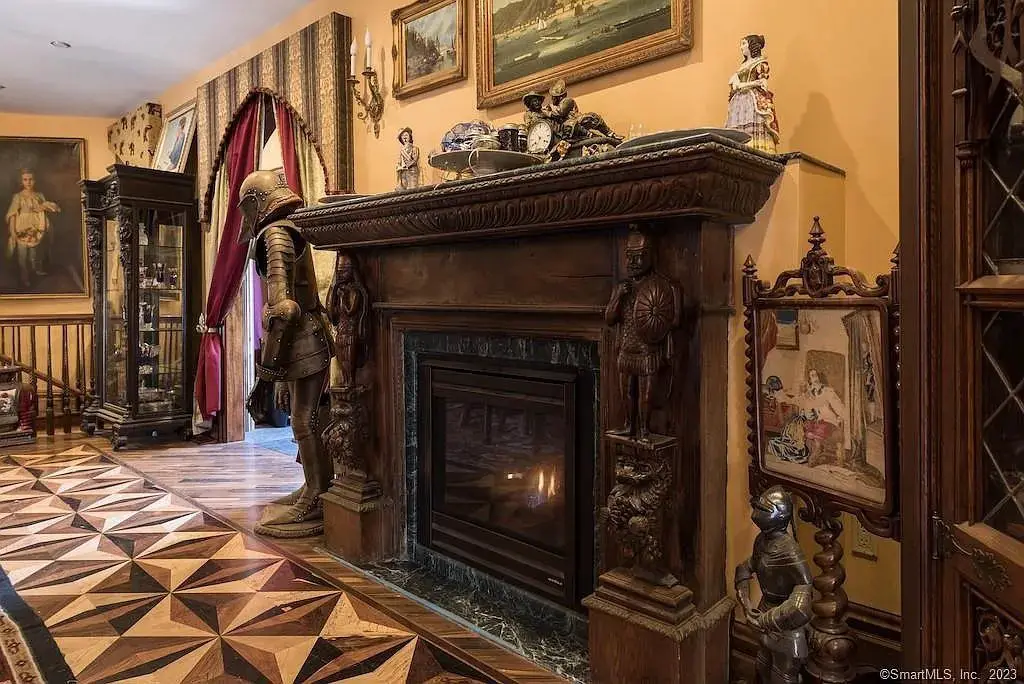 The castle is defined by superior craftsmanship, blending over 25 species of exotic hardwoods sourced from around the globe. Hand-inlaid wood floors, intricately carved doors, and period-inspired stained-glass windows give each room a distinctive character. Twelve fireplaces, each designed with ornate mantels, add warmth and grandeur throughout.