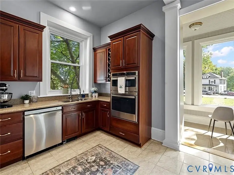 The main level is designed for both elegance and comfort. Two generous living rooms provide ample space for entertaining, while a formal dining room is ready for memorable gatherings. The updated kitchen features granite countertops, cherry cabinetry, and newer stainless steel appliances, blending functionality with refined style.
