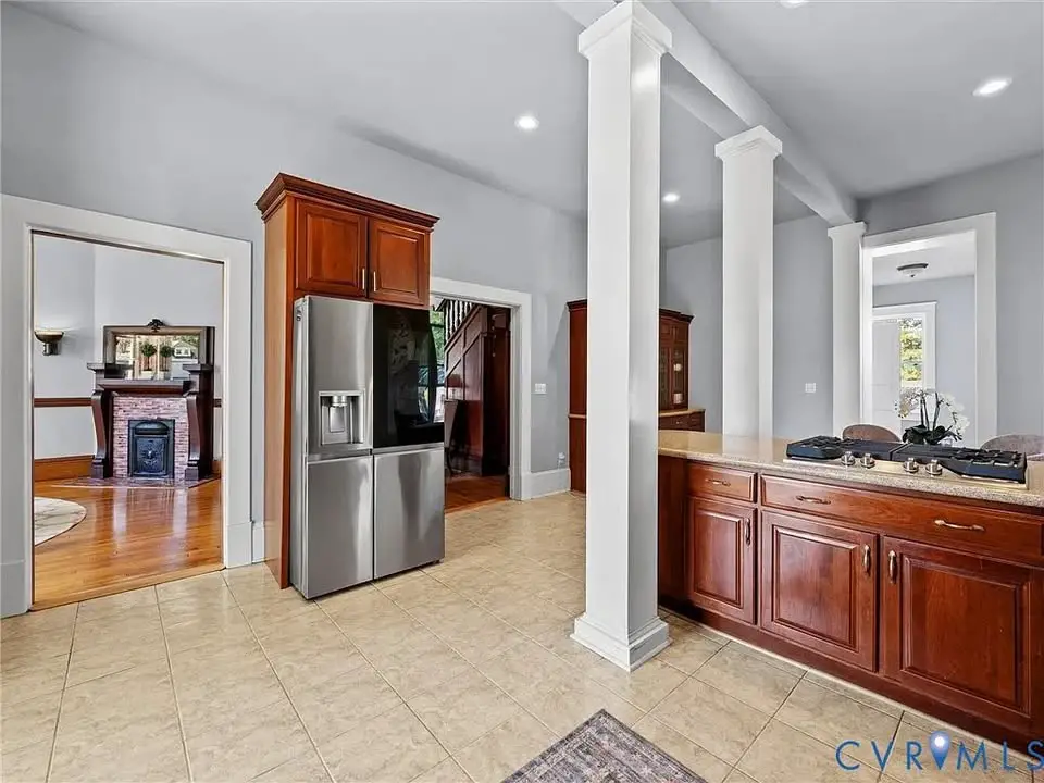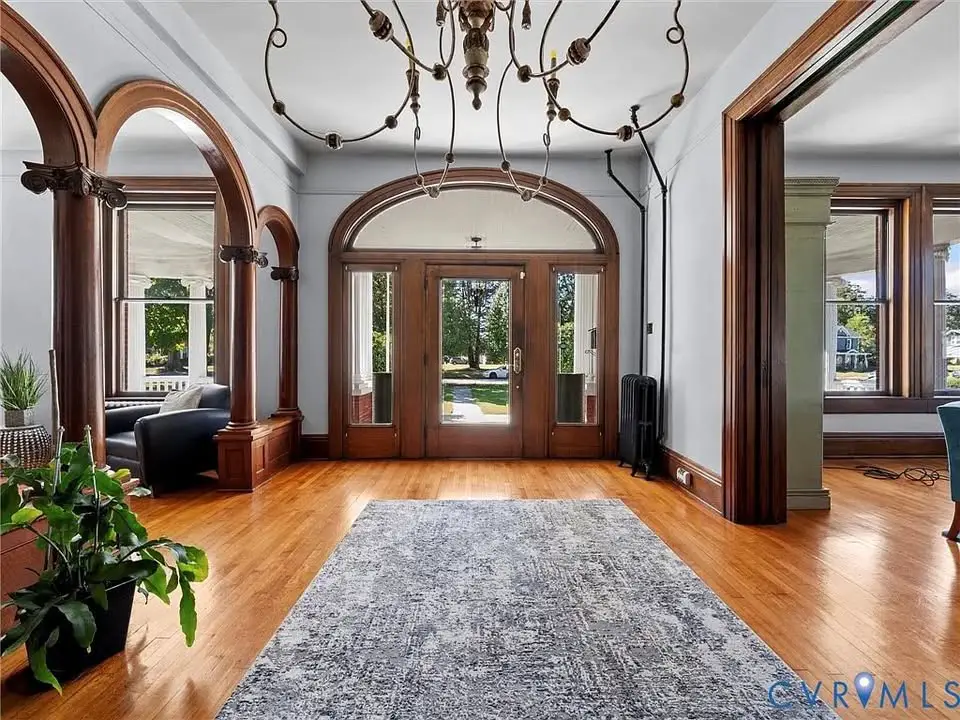 Inside, the home reveals a captivating mix of old-world beauty and modern updates. Sunlight streams through large windows, highlighting 11-foot ceilings, hardwood floors, and intricate moldings that showcase the artistry of the early 1900s. Every corner offers something special — two grand staircases, arched doorways, decorative transoms, and six fireplaces with ornate mantles and tile surrounds that speak to the home’s rich past.