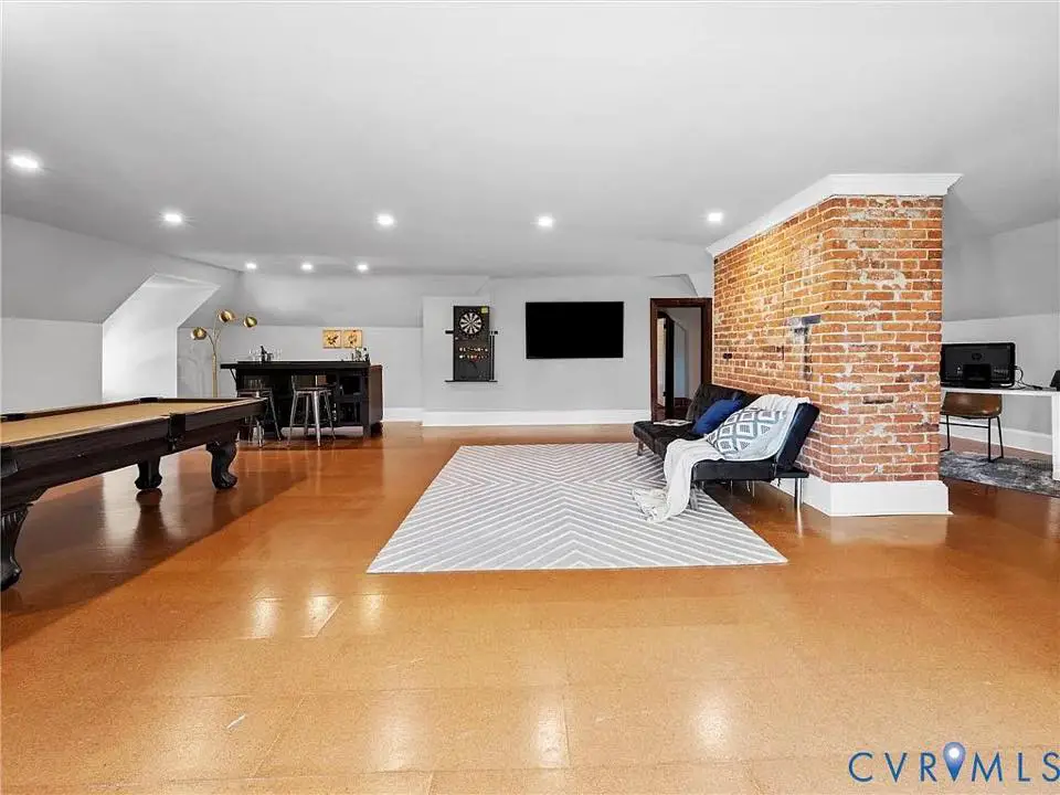On the second floor, a wide central hall opens to a cozy sitting area and leads to a balcony with a chandelier view of Oliver Avenue, perfect for relaxing evenings. The third floor offers a true surprise — over 1,000 square feet of recreational space, including a bar, pool table, and office area. This versatile level is ideal for entertaining, creative projects, or simply unwinding in style.